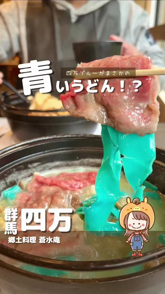 【群馬/四万】蒼いおっ切り込みうどんと癖あり店主が面白い! 【店名】郷土料理 蒼水庵 【公式Instagram】@izumiya_sousuian 【住所】📍群馬県吾妻郡中之条町四万4001-3 【電話番号】📞0279-26-9688 【営業時間】 昼11:00〜15:00 Lo14:30 夜18:00〜23:00 Lo22:00 【定休日】木曜日、第二第四水曜日 【駐車場】市営駐車場 【座敷】無 【個室】無 ※最新情報はお店にご確認ください ━━━━━━━━━━━━━━━ ◾️ レポート Report ━━━━━━━━━━━━━━━ 四万温泉街の入り口にある蒼水庵さん。 川が流れるのをみながら自然を満喫してお食事できる。 ここでは四万ブルーな青いおっ切り込みうどんがあるの! ブルーのうどんって大丈夫?と思うかもしれないけど、これが美味しいんだよ!笑 あとね、化学着色料ではなく、なんだったかな・・・店主のキャラが濃すぎてメモるの忘れたけど、実で色をつけてるそうで、安心安全! 勇気が出ない方はもちろん普通の白いうどんもあるよ! ベースは醤油、味噌、豆乳があるんだけど店主のおすすめは豆乳! 確かに、醤油もおいしかったけど、豆乳のが好き! もかも豆乳推しでーす! カレーパウダーで味変も楽しんでね! さて、このお店のもう一つのウリは・・・ とっても面白い店主さん!! これはね、行ってみないと動画には収まりきれないよ。笑 ちなみに夜はマスクマンになるんだとか。笑 きっと楽しい四万温泉旅になるよ♪ 是非行ってみて♪ ━━━━━━━━━━━━━━━ ◾️ 注文メニュー Menu ━━━━━━━━━━━━━━━ ・上州牛おっきりこみうどん ¥2,310 ・豆乳胡麻おっきりこみうどん ¥1,650 ・炊き込みご飯 ¥220 ※訪問時の情報です ━━━━━━━━━━━━━━━ ◾️ プロフ Profile ━━━━━━━━━━━━━━━ 《群馬もぐもぐ》 群馬中心にグルメ情報のみを発信🍴 @gunma_mogumogu 《もか》 群馬もぐもぐの中の人、もかがすすめる グルメ🍴・スポット🎡・美容💆♀️・旅✈️ @moca_mogumogu ━━━━━━━━━━━━━━━ #群馬グルメ #群馬旅行 #四万温泉