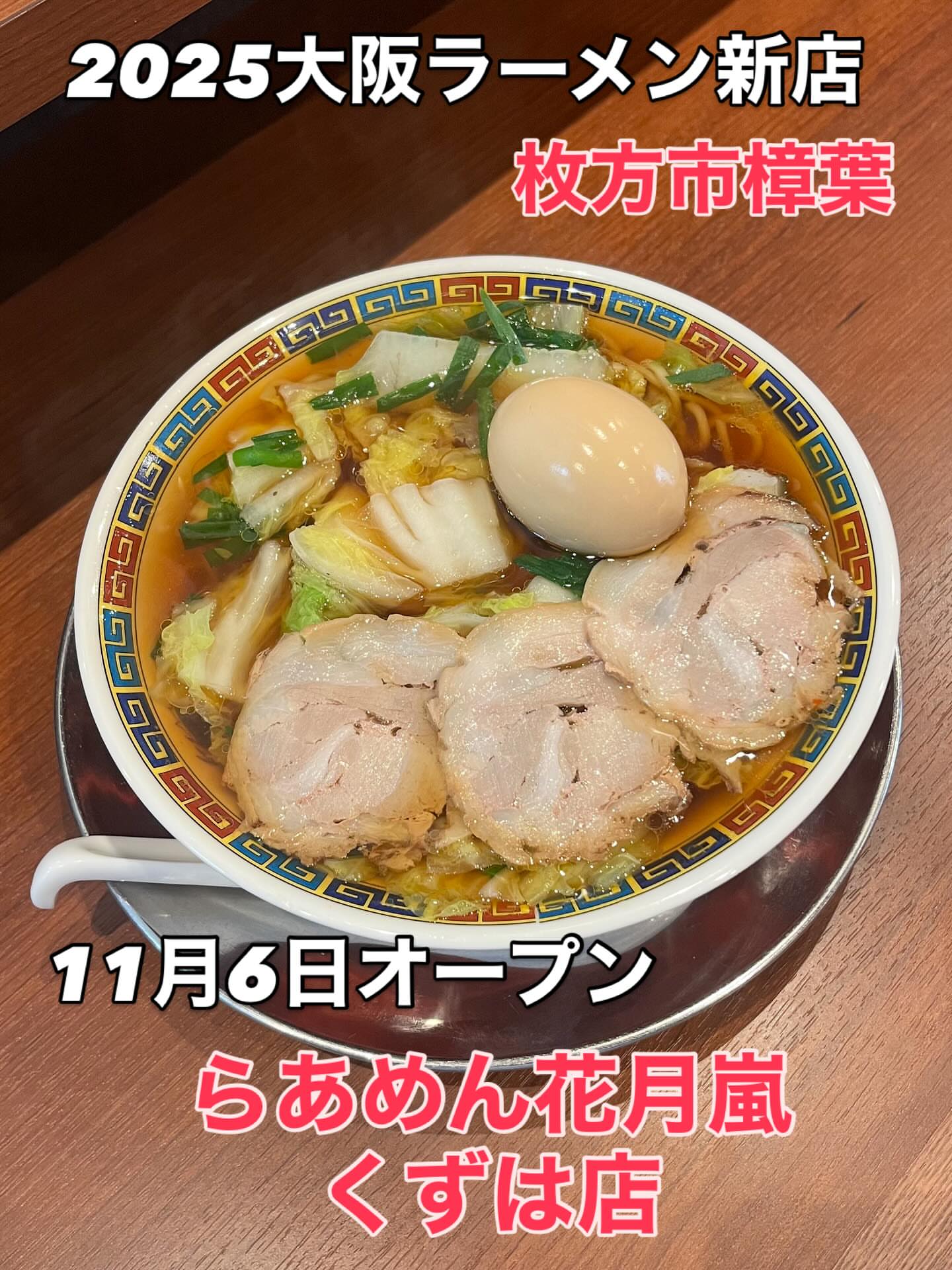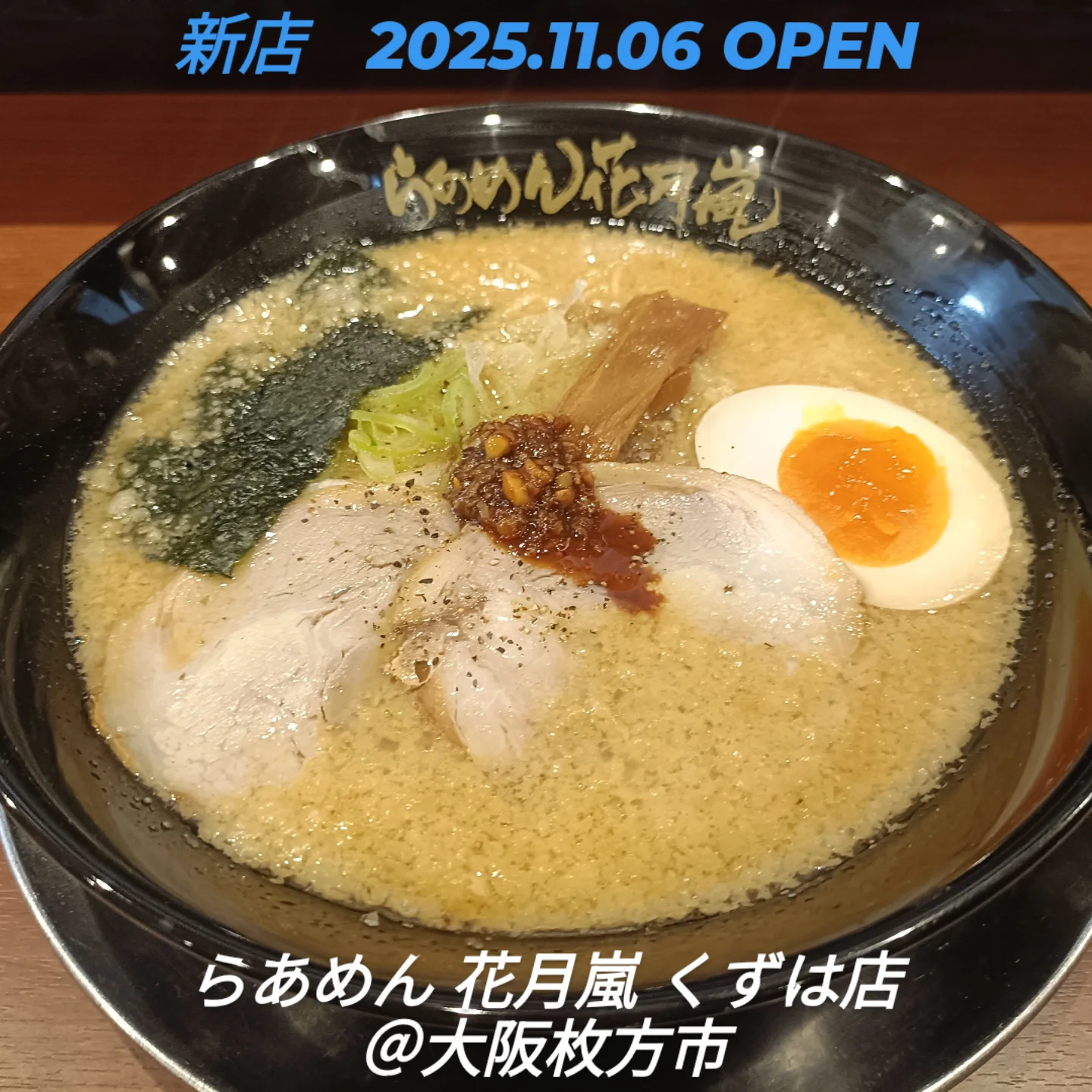 【新店情報】 らあめん 花月嵐 くずは店@京阪樟葉 11月6日オープン 豚骨醤油 920円 こちらはグロービート・ジャパンが手掛ける『花月嵐』さんの新店舗となるお店です。メニューから選べる無料の壺ニラもやし・生ニンニククラッシャーで味の変化を楽しむことができます。次回、使えるスペシャルクーポン券を配布しています。(^-^) http://toyotune.blog107.fc2.com/blog-entry-6390.html らあめん 花月嵐 くずは店 大阪府枚方市町楠葉1-4-5 Pなし 11:00~1:00 無休 072-800-1875 @kagetsuarashi_official 創業2025年 #らあめん花月嵐くずは店#枚方市ラーメン#枚方市新店#樟葉ラーメン#樟葉新店#ラーメン新店#大阪グルメ#大阪ラーメン#大阪ラーメン新店#新店ラーメン#新店#新店舗オープン#新規開店#オープニング#ニューオープン#新規オープン#ラーメンインスタグラム#麺スタグラム#ラーメンインスタ