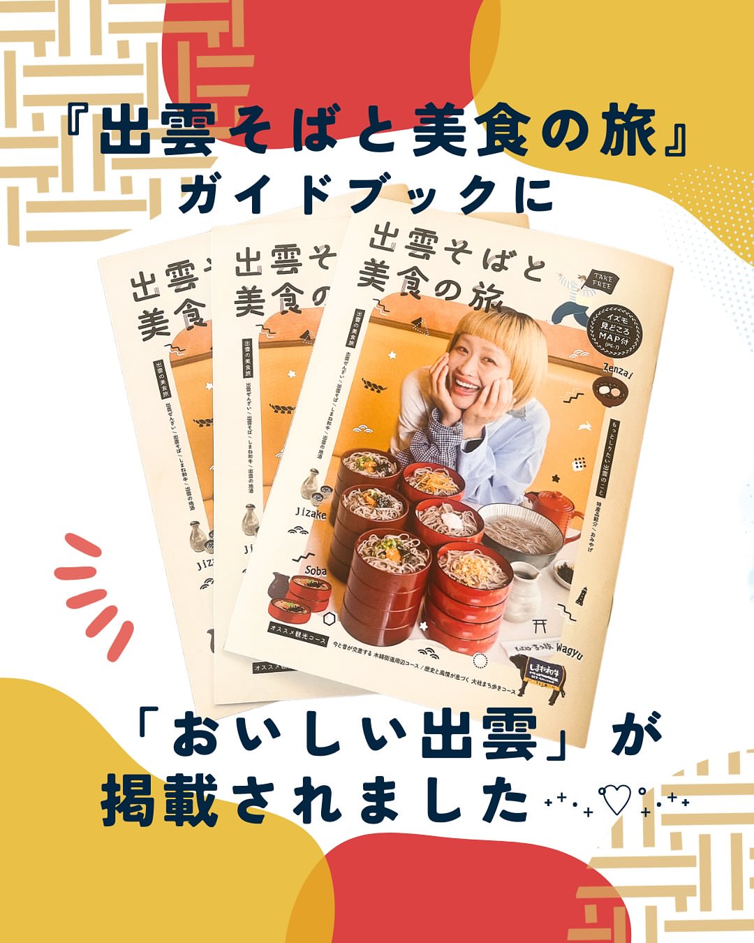 📖『出雲そばと美食の旅』ガイドブック ロシアン佐藤さんが目印の素敵なガイドブック 『出雲そばと美食の旅』に「おいしい出雲」が掲載されています🎉🎉🎉 出雲そばやあごの焼き、和菓子にお茶、そして調味料まで。 「おいしい出雲」認定商品を、名物(!?)事務局長がご紹介✨ 紙面は「おいしい出雲」のイメージカラー・赤をモチーフに、とても素敵に仕上げてくださいました❣️ さらに、出雲市内130以上の飲食店・観光施設が参加する モバイルスタンプラリーも実施中🙋♀️ 豪華景品が当たるチャンスですので、ぜひご参加ください! ガイドブックは観光施設・ホテル・道の駅などに設置中。 『出雲そばと美食の旅』の公式HPからも ガイドブックをダウンロードできます📲 詳しくは 👉 @izumosobatobisyokunotabi をチェック! ୨୧‥‥∵‥‥∵‥‥∵‥‥∵‥‥∵‥‥∵‥‥∵‥‥∵୨୧ 出雲でうまれたおいしい特産品♩ ご縁をつなぐ「おいしい出雲」 ୨୧‥‥∵‥‥∵‥‥∵‥‥∵‥‥∵‥‥∵‥‥∵‥‥∵୨୧ #おいしい出雲 #おいしい出雲認定商品 #出雲そばと美食の旅 #そば旅 #出雲お土産 #出雲土産 #出雲観光