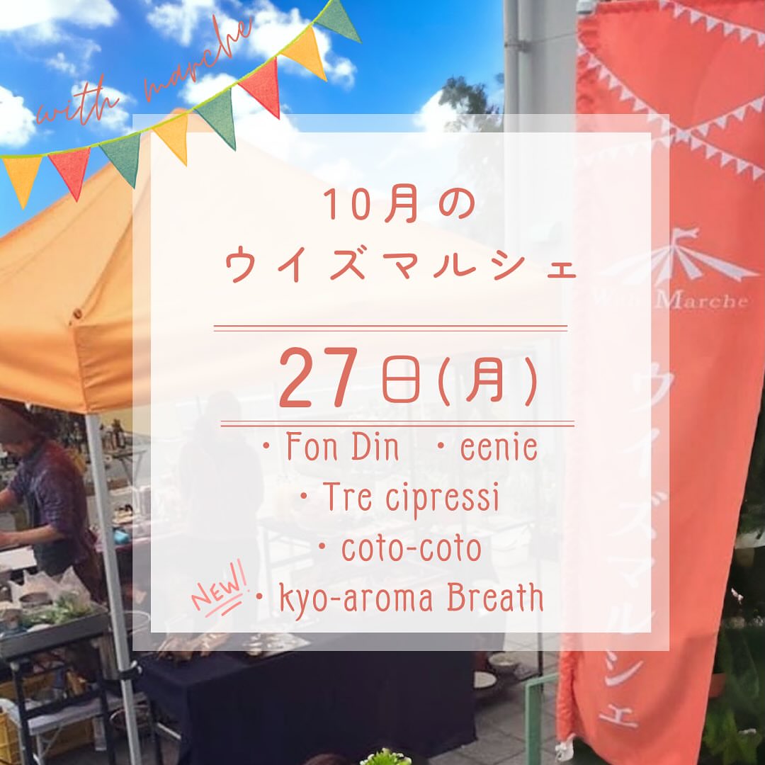 ˗ˏˋ 10/27 ウイズマルシェ開催 ˎˊ˗ . . 𖥧 𖥧 𖧧 ˒˒. . 𖡼.𖤣𖥧 ⠜ . . 𖥧 𖥧 𖧧 ˒˒. . 𖡼. .𖥧 𖧧 ˒˒. . 𖡼.𖤣𖥧 ⠜ . . 今月のウイズマルシェ♪♪ 10月27日(月) 11:00~16:00 𖧧Fon Din(タイ料理) 𖧧eenie(スイーツ) 𖧧Tre cipressi(オリーブオイル) 𖧧coto-coto(無添加食品) 🆕𖧧kyo-aroma Breath(アロマ、植物コスメ) 今月は ܰ kyo-aroma Breath ܱ さんが ウイズマルシェに初出店です✨ 地域の植物や原料を使い、洗剤や柔軟剤、 アロマやお化粧品などを製造されてます🌱 ココロとカラダを心地よく整え、 自分に寄り添う優しいケア商品が揃います♡ 美味しいスイーツはeenieさん💕 モンブラン(¥800)は当日分もありますが、事前ご予約可能です🌰 土曜夜までにDMまたは、お電話にてご注文ください😌 美味しいもの好き、楽しいこと好きさん、 どなたでもお気軽にお越しください☺️ ウイズ2階の快適な空間で ゆっくりお召し上がりいただけます☕︎ 舞鶴市桃山町 4-2 ウイズビル2階にて開催 駐車場あります . . 𖥧 𖥧 𖧧 ˒˒. . 𖡼.𖤣𖥧 ⠜ . . 𖥧 𖥧 𖧧 ˒˒. . 𖡼. .𖥧 𖧧 ˒˒. . 𖡼.𖤣𖥧 ⠜ . . #ウイズマルシェ #ウィズマルシェ #京都北部イベント #舞鶴 #綾部 #福知山 #小浜 #高浜 #美味しい #楽しい #ランチ #スイーツ