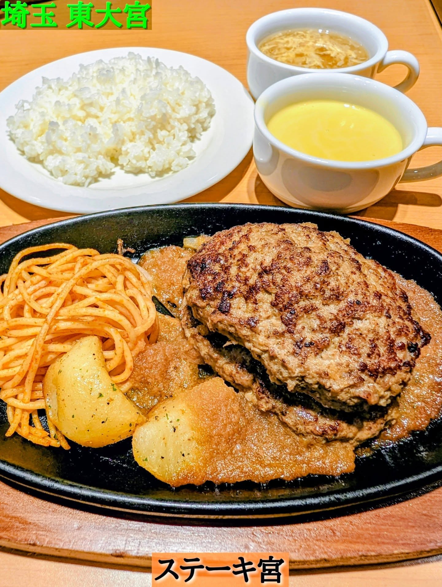 。 🚃東大宮駅近く @steakmiya38 ステーキ宮🌟 🗾栃木県宇都宮市✨ステーキ宮✨創業1975年🌟 🗾群馬県桐生市✨フライングガーデン✨創業1976年🌟 🗾群馬県前橋市✨ステーキのどん✨創業1976年🌟 🗾北関東勢🌟魅力的な🥩チェーン店ばかりですね🤣🤣🤣 ─────────────────────────── 『いつだって大丈夫👍♪この世界は🟤ハンバ〜グ♫』 『楽しんだ〜もん勝ちだ♪🟤ハンバ〜グ♫』 『また🍚米食べ〜る♪🟠宮のタレでハンバ〜グ👍♫』 『アゴが疲〜れても💦食・べ・る😁♪』 『結局は🟤ハンバ〜グ〜👍♪この世界は🟤ハンバ〜グ♫』 『🟠ソースが主役の🟤ハンバーグ😆👍♫』 『その🥩お肉だけが♪僕の☀太〜陽♫』 『君が笑える為の🧏🏻♀️ハンバ〜グ♪この肉を食べ続け〜る♫』 ─────────────────────────── ちょっと何🤔歌ってるか分かりませんけど💦 ステーキ宮オリジナル【🟠宮のタレ】絶品です🤣🤣🤣 🟠ステーキ宮さんと言えば… 何と言っても『宮のたれ』 ☝️これを目当てに来店する人も多いかと思います😊 普通の🛒スーパーでも販売しており👍 家庭で🔥焼く🥩ステーキに宮のたれ使用すると… ✨すて〜き✨な🥩ステーキに変身します🤭 家庭用🟠宮のタレ冷蔵保存なので🏠️だと冷たいのですが お店だと🔥熱々🟠宮のタレなんですね👍 あったかい🟠宮のタレ🌟こんなのあったかい🤭 宮ハンバーグダブル180g ✕2 税込2079円🌟 宮ハンバーグ180g 税込1199円🌟 【平日ランチタイム】 🍚ライスor🍞パンどちらか😊 🍚ライスだとおかわり自由🙌 ☕️4種のスープバーがセット料金になっております🙌 どのスープも美味しくて4種🌟全部飲み干しました😁 🥩牛100%🌟宮ハンバーグダブル360g😆🙌 最初は✨宮のたれ強🧄🧄✨選択😁 🧄にんにく👊パワーMAX💪 これでもかっ💦ってくらい🧄凄いです❢❢🤣🤣🤣 途中で✨宮のたれ✨&🍚ライスおかわり自由✨😆👍 🐂牛100%宮ハンバーグ🌟 🥩肉肉しい🐂牛100%を想像してましたが… ふっくら柔らか👍宮のタレを存分に吸い込んでくれます🙌 やはり主役は『宮のタレ‼️』 このタレが🥩お肉を更に引き立てて最高です😆🙌 🍚ライス盛り盛り進むので💦 ✨おかわり自由✨ホント助かります🤣🤣🤣 ステーキ宮さん✨ お腹いっぱい🌟夢いっぱい🌟 すて〜きなランチをご馳走様でした😊🙏 #埼玉グルメ #東大宮グルメ #東大宮ランチ #ステーキ宮 #ステーキ #宮ハンバーグ #宮のたれ #宮のたれ強 #ライスバー #ミセスグリーンアップル #ダンスホール #いただきます #おいしい #ご飯大盛り #ごちそうさま #インスタ映え #グルメ好きと繋がりたい #好きなお店は食べ放題 #好きな言葉はおかわり自由 #ご飯大盛り無料は断れない #お腹いっぱい #夢いっぱい