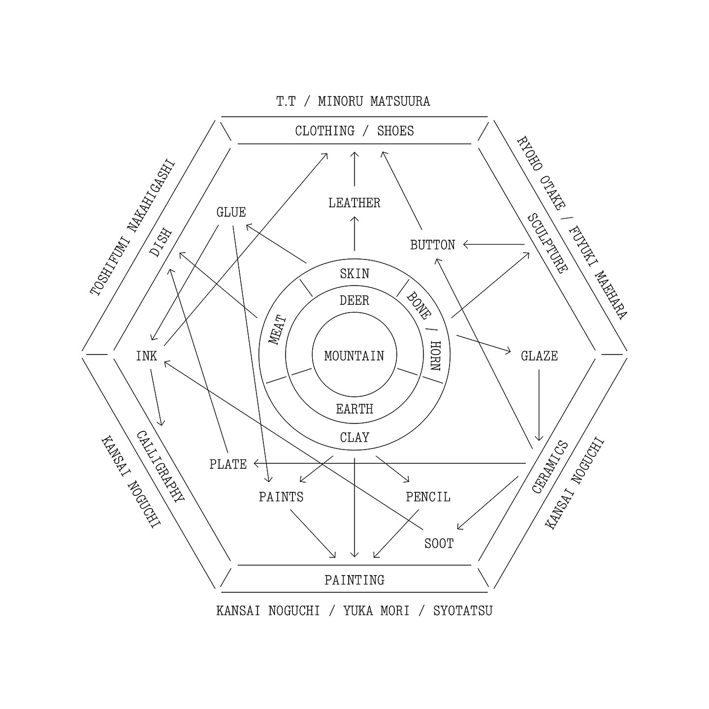 現 代 素 材 問 答 Our project diagram 京都、美山 美しい山々に囲まれた、静かな里 そこに暮らす人々、奥山に住む動物 その境界線がいま揺らいでいる 里山の生活を守る中で、駆除される鹿 獣害を巡るいくつもの問題、様々な正義 その葛藤を感じながら、私たちは狩猟に同行した 駆除された鹿の肉はジビエとして流通するが 皮や骨などは処理が難しく、廃棄されている この問題に様々な産業が一緒に向き合ったらどうなるだろう 食、ファッション、アートの境界線を超えて 命の恵みを使い切る 展覧会/イベント情報 at ristorante DONO 11.04 - 11.22 at T.T GION 11.08 - 11.24 at Art Collaboration Kyoto 11.14 - 11.16 出展作家 大竹亮峯 笑達 野口寛斉 前原冬樹 松浦稔 森夕香 T.T ristoranteDONO Cooperation 一網打尽 Diagram design OK-RM Produce 鐘ヶ江英夫