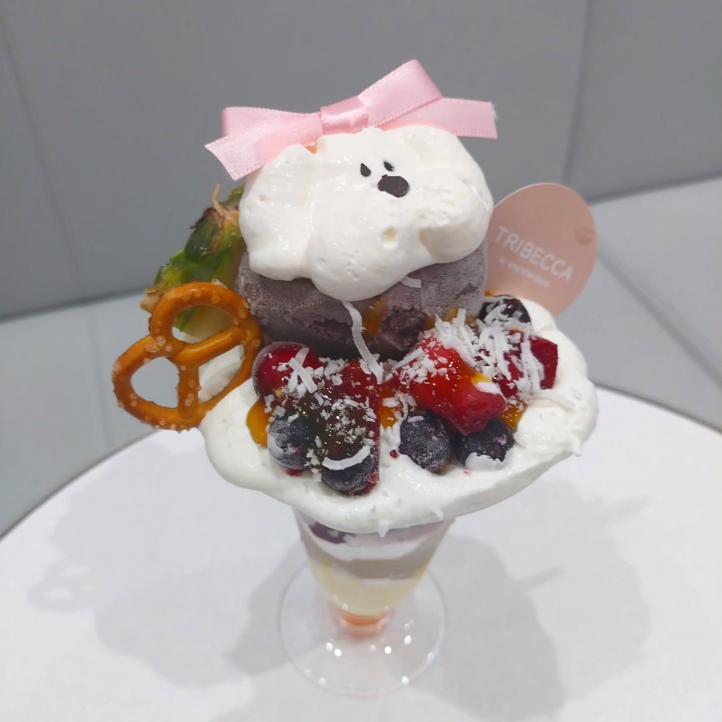 HEP FIVEの7階にTRIBECCA CAFEが期間限定でオープンしてた💐写真はアサイーパフェ💜ワンコクリームが可愛い🐶(抹茶とベリーのパフェもあった...