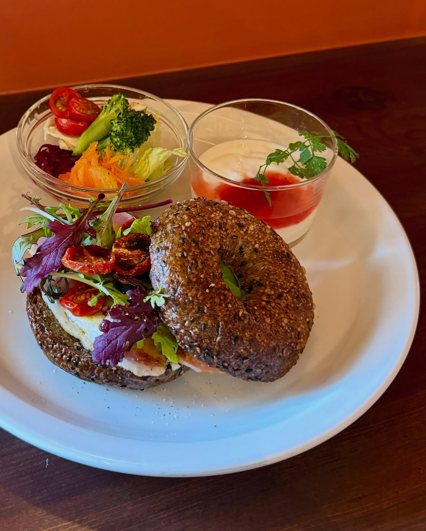 サラダ、ヨーグルト、ベーグルサンド