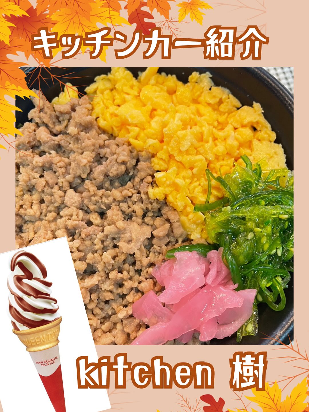 そぼろ丼、フリフリポテト、ソフトクリーム、かき氷、チーズボール