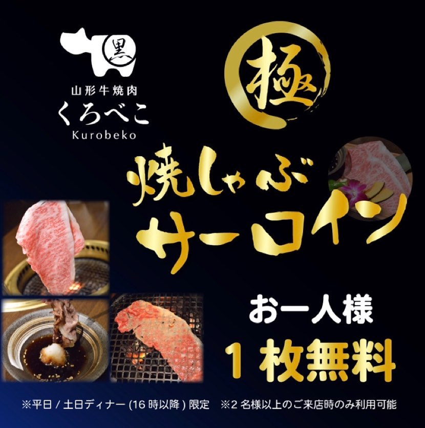 くろべこ名物「焼きしゃぶサーロイン」を期間限定で配っちゃいます!期間中クーポン提示で1人1枚プレゼン...
