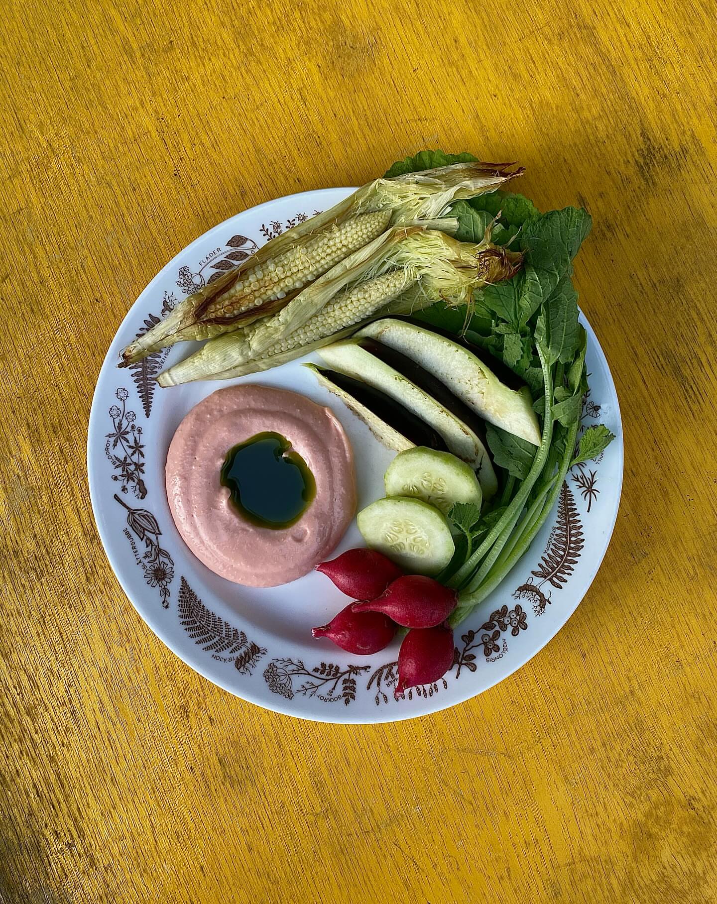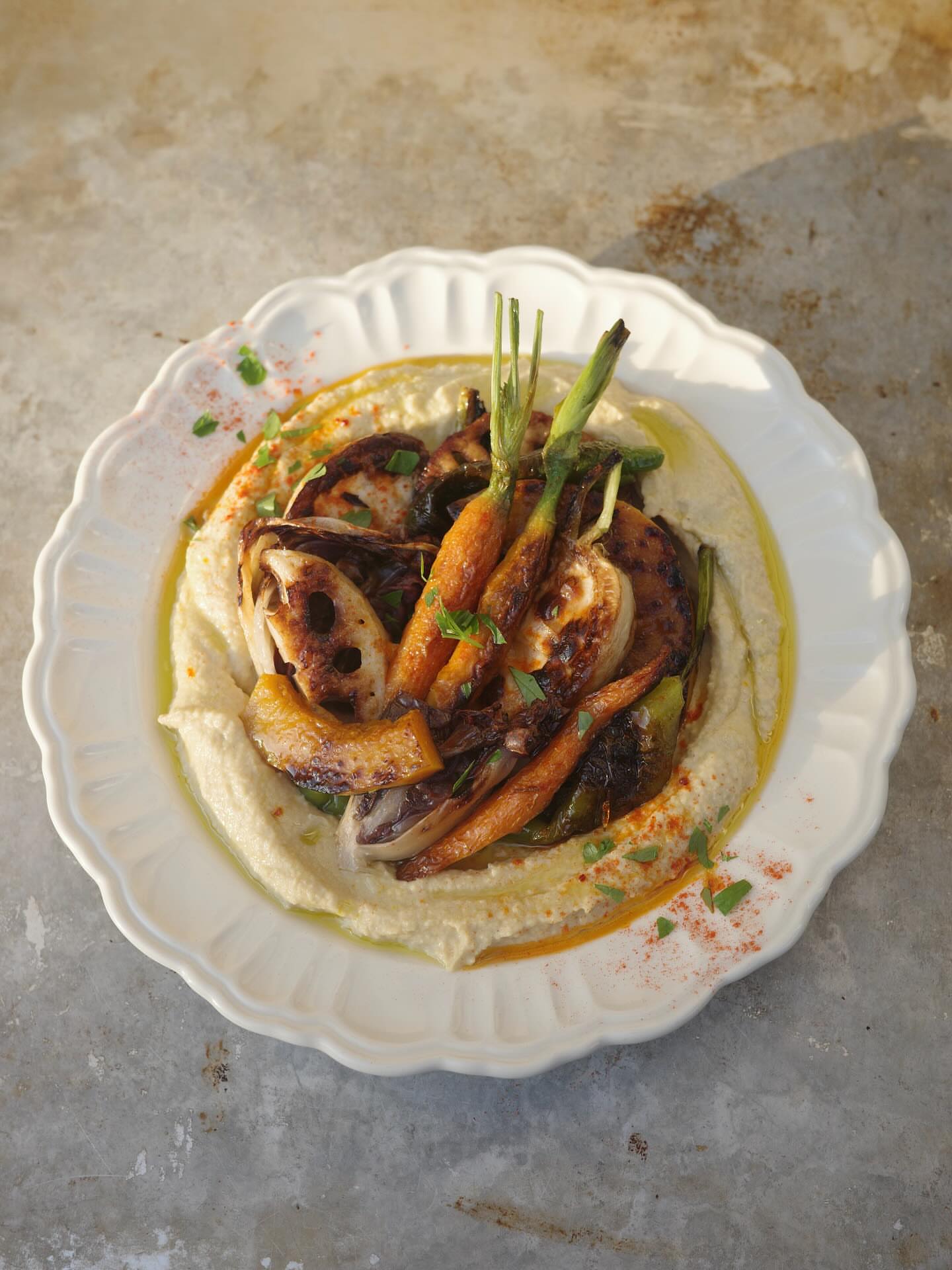 秋野菜のグリルと焼きナスのフムス サフランオイル
