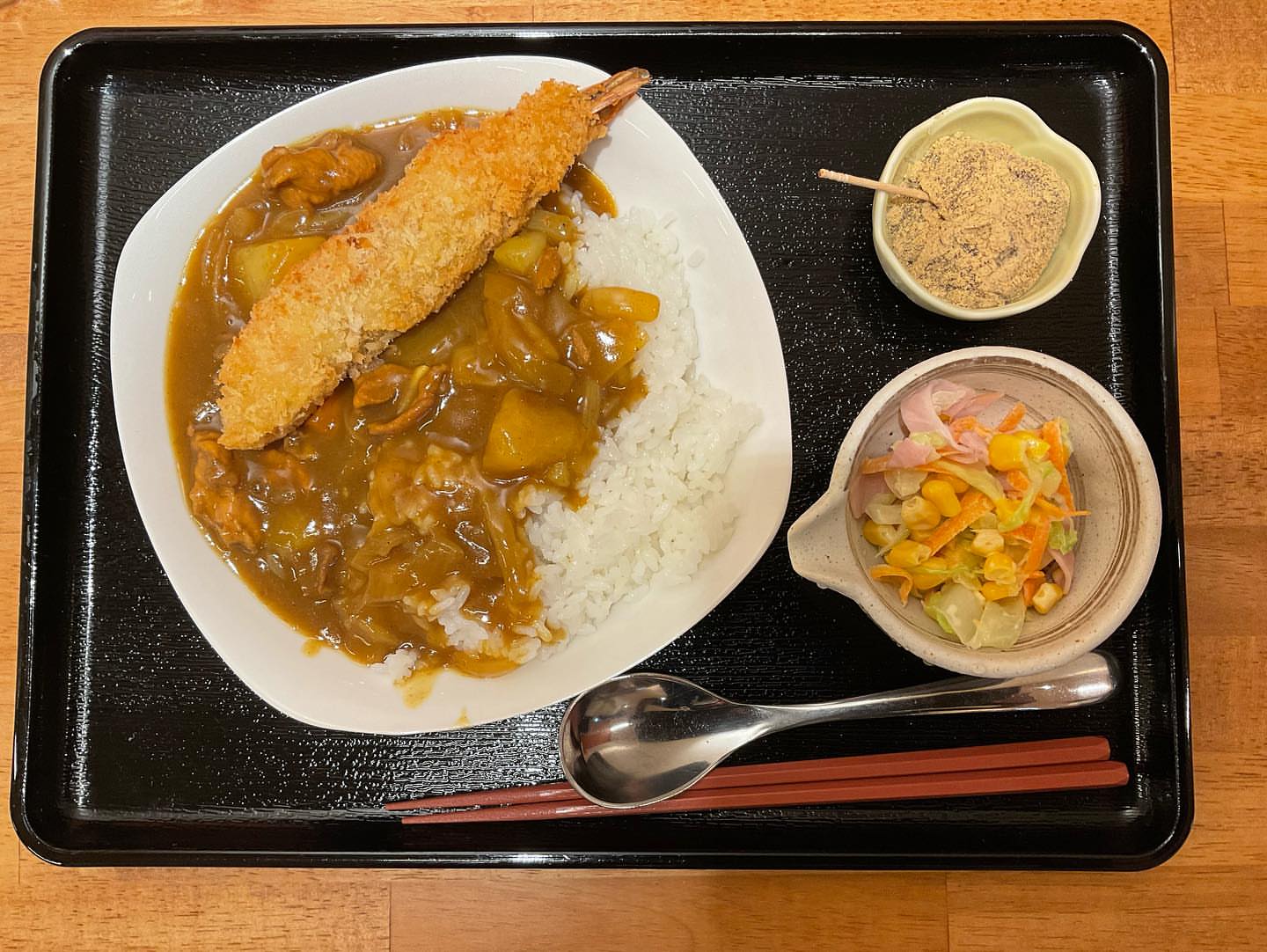 今日はなんと豪華なエビフライ一匹が丸ごと乗ってるエビフライカレーでした!そしていつも大人気のコールスローサラダとわらび餅専門店 門藤 姫路本店さん提供のわらび餅...