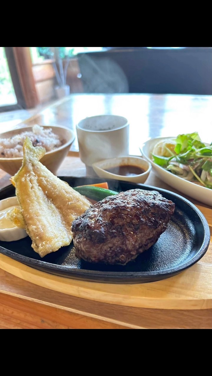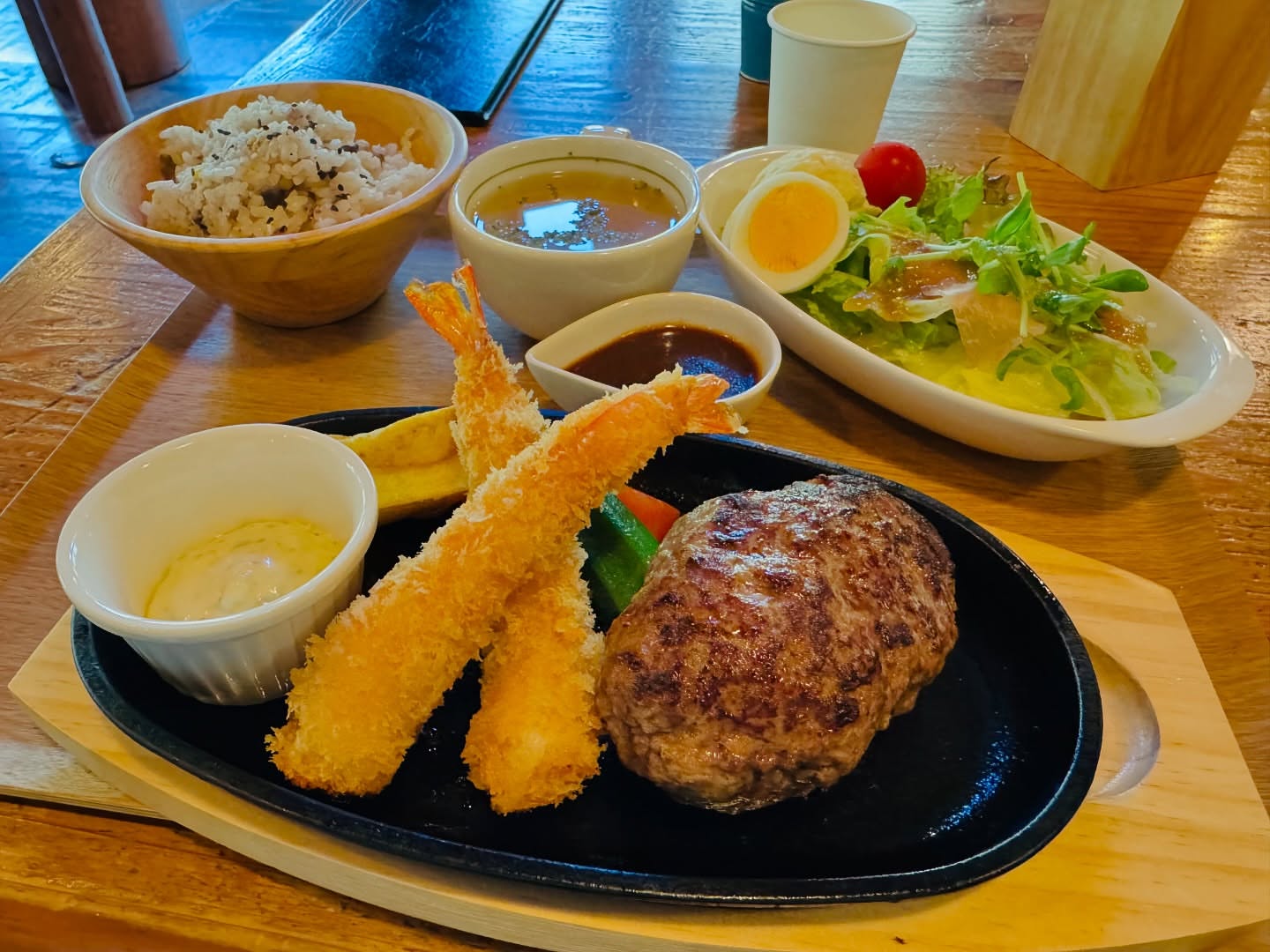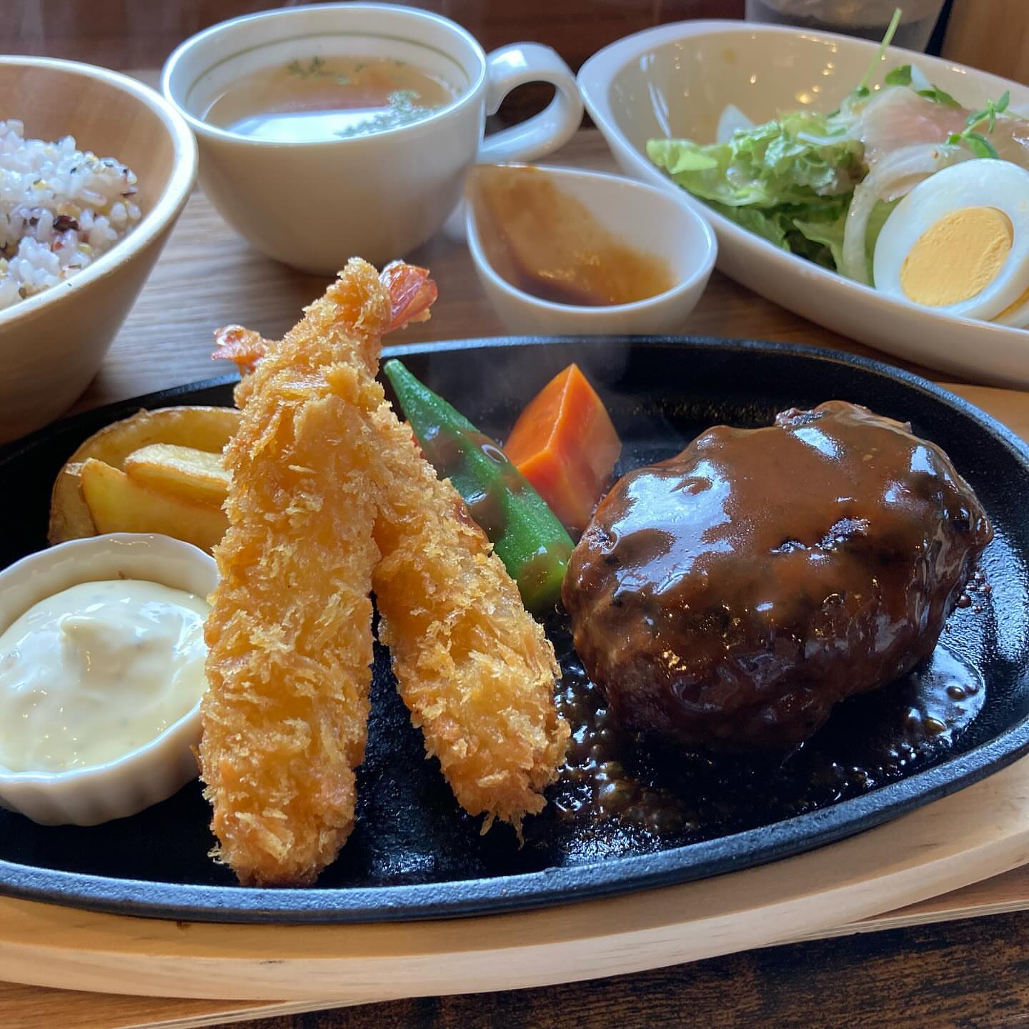 食べ応えのあるハンバーグに、ぷりぷりの🍤