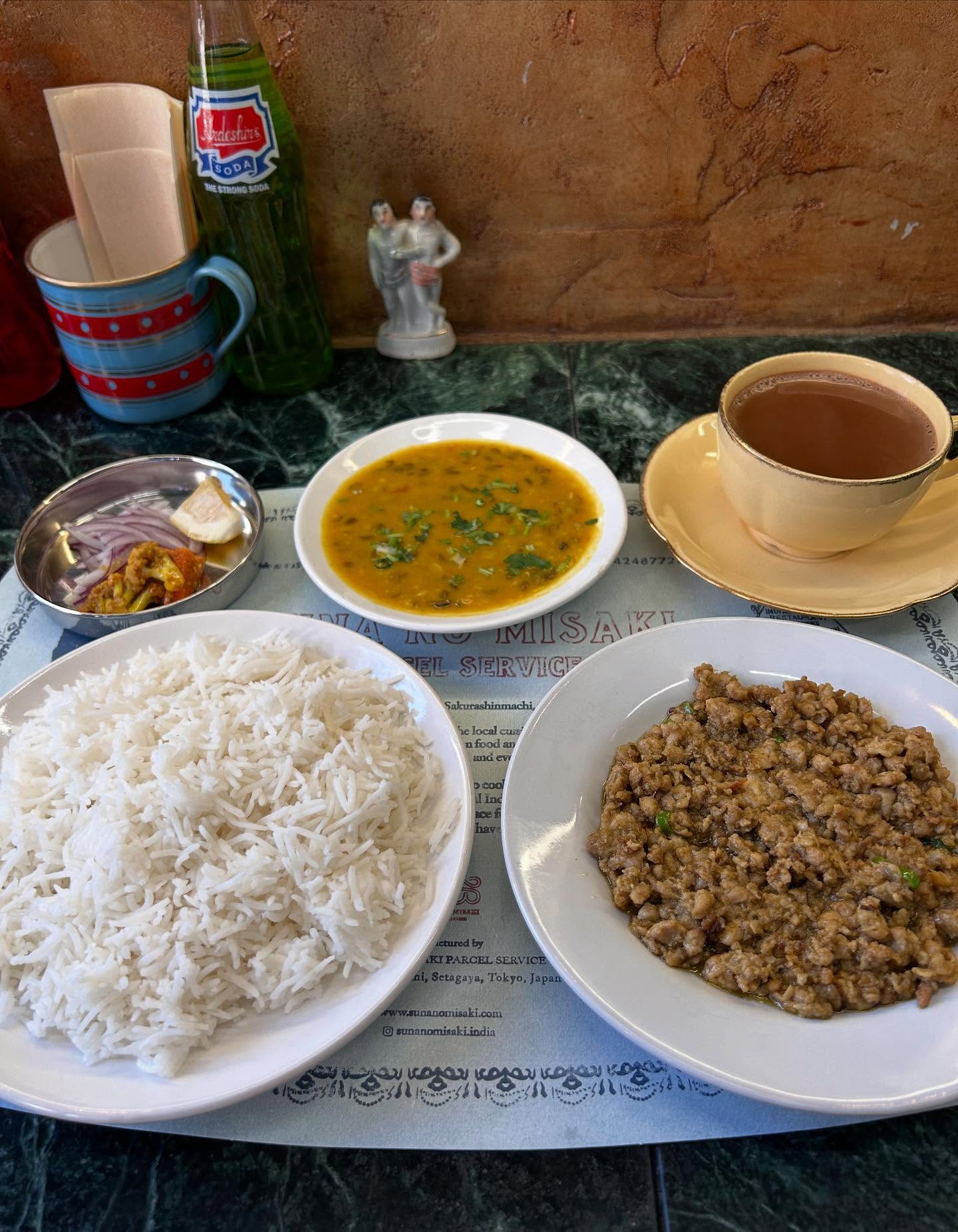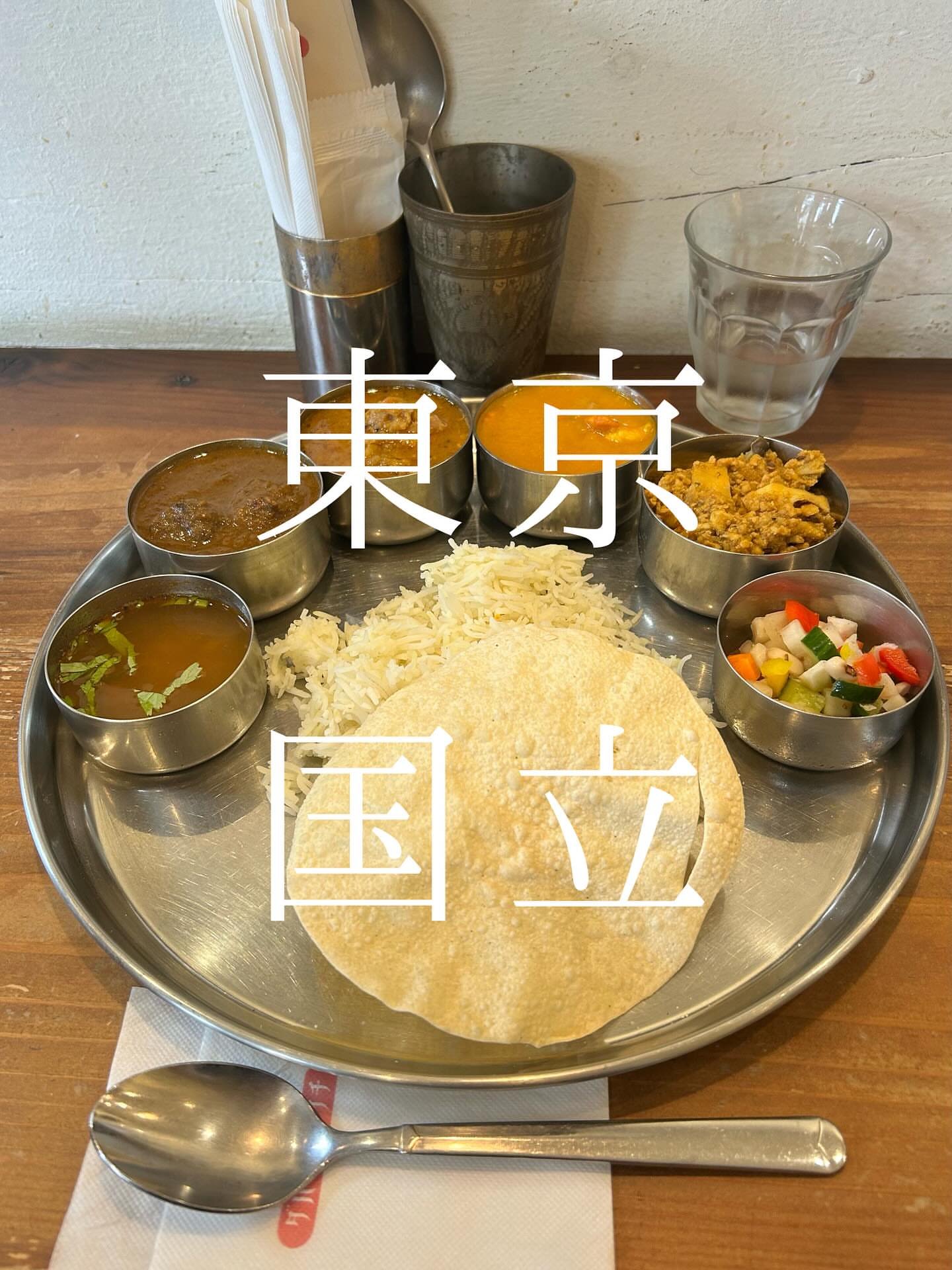 昭和記念公園に来たので国立のお店ダバクニタチに。ダバ定食 塩チキン キノコキャベツキーマ サンバル ラッサム 日本米をバスマティライスに変更
