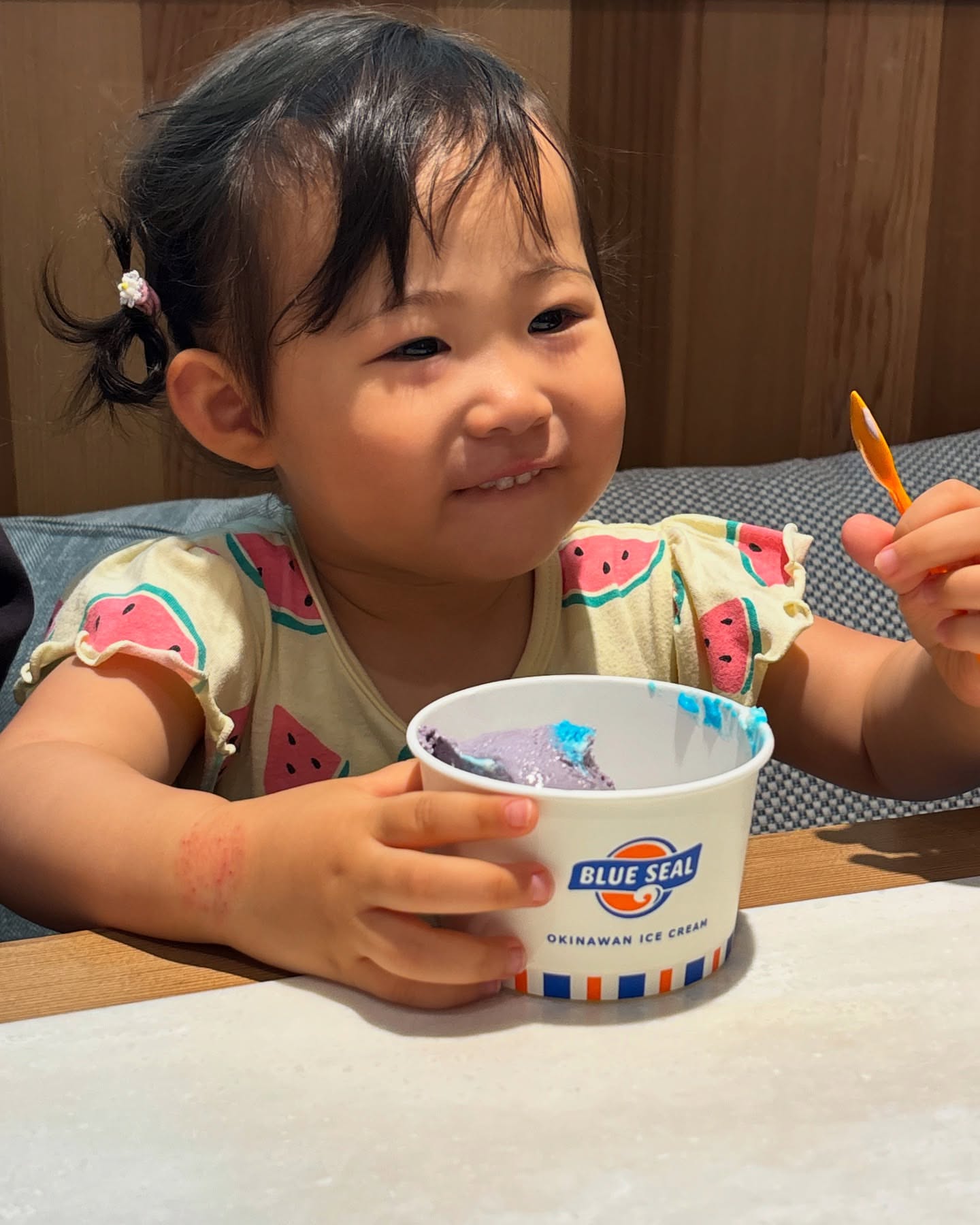 初めてのアイスで美味しいポーズ😋