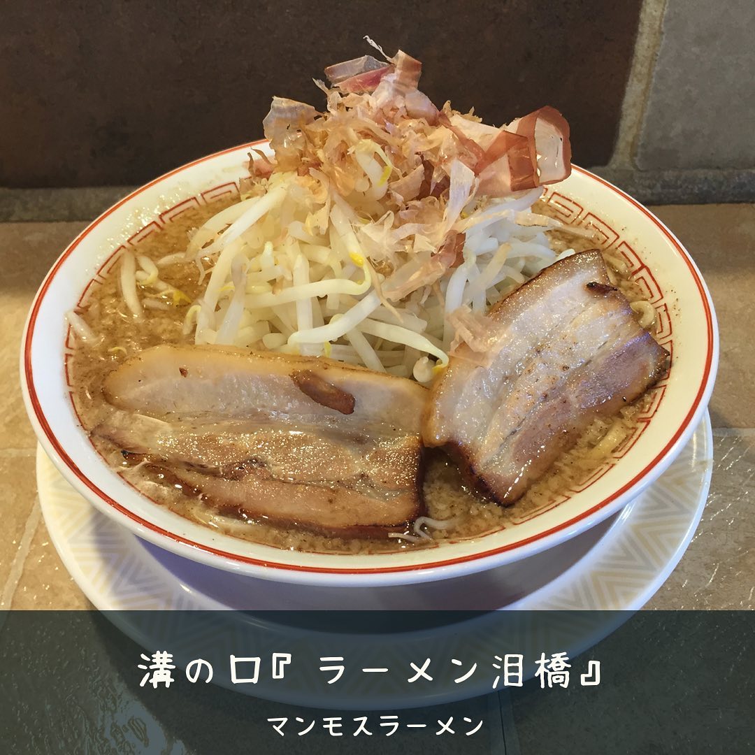 川崎市高津区溝口の『ラーメン泪橋』は、二郎系インスパイアの人気店。マンモスラーメンは約300gのストレート極太麺と、炙りチャーシュー、背脂と魚介のダシが特徴です。11〜15時の昼営業で、外で食券を購入してから並ぶスタイル。