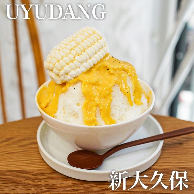 新大久保の期間限定スイーツUYUDANGは、ピンスとソフトクリームの専門店です。看板のスウィートコーンピンスは白いとうもろこしが乗ってミルキー、コーンポタージュ風ソースがアクセント。白い内装とチョアの足跡が可愛いです。8/6-8/31期間限定OPEN。