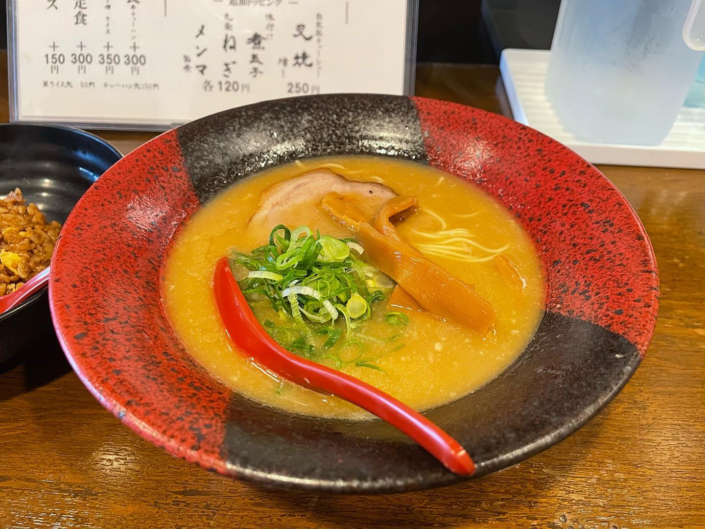 マエちゃんラーメン並盛(背脂、もやし、ニンニク)、半チャーハンセット1,300円...