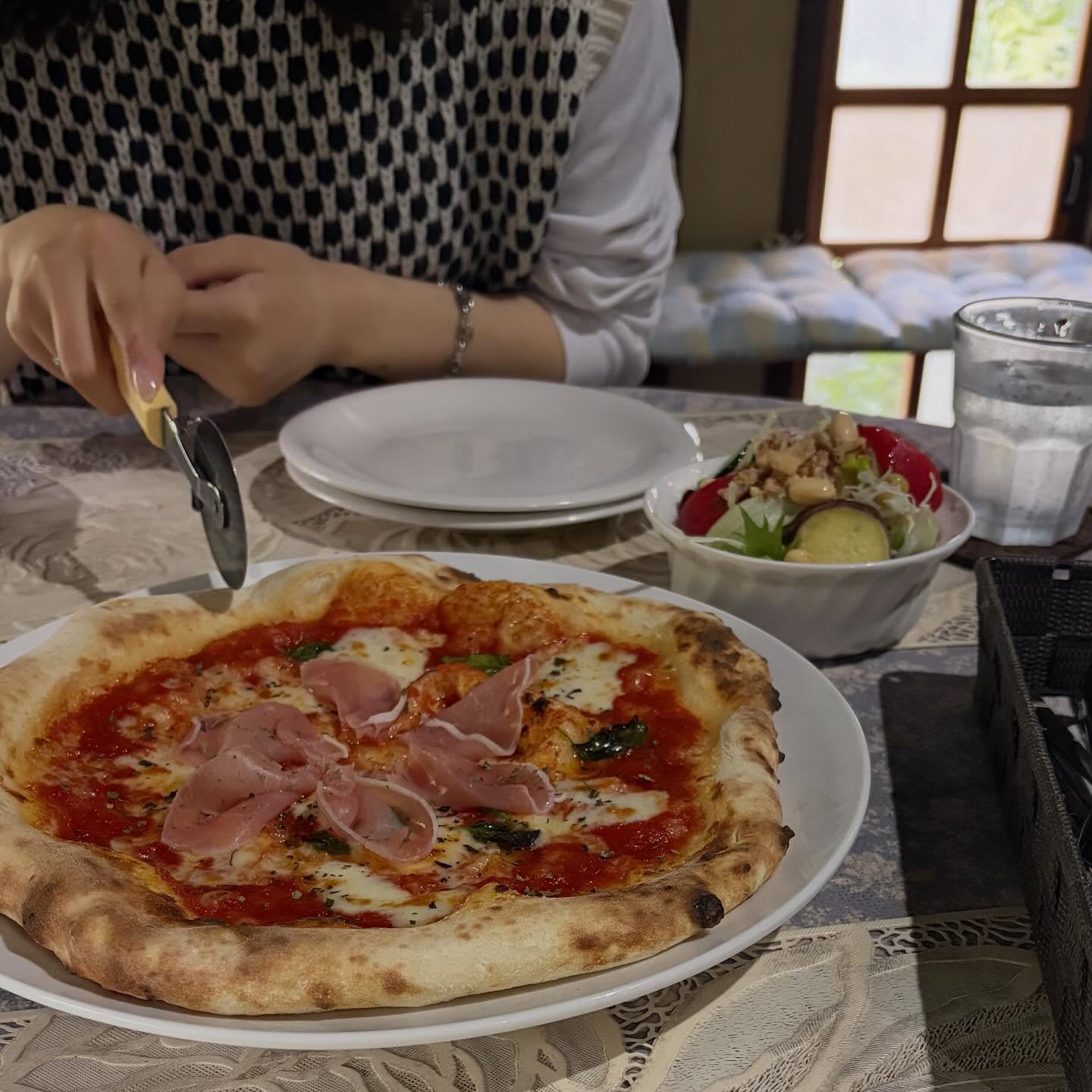 テラスで焼きたてピザを頬張り至福時間🤍
