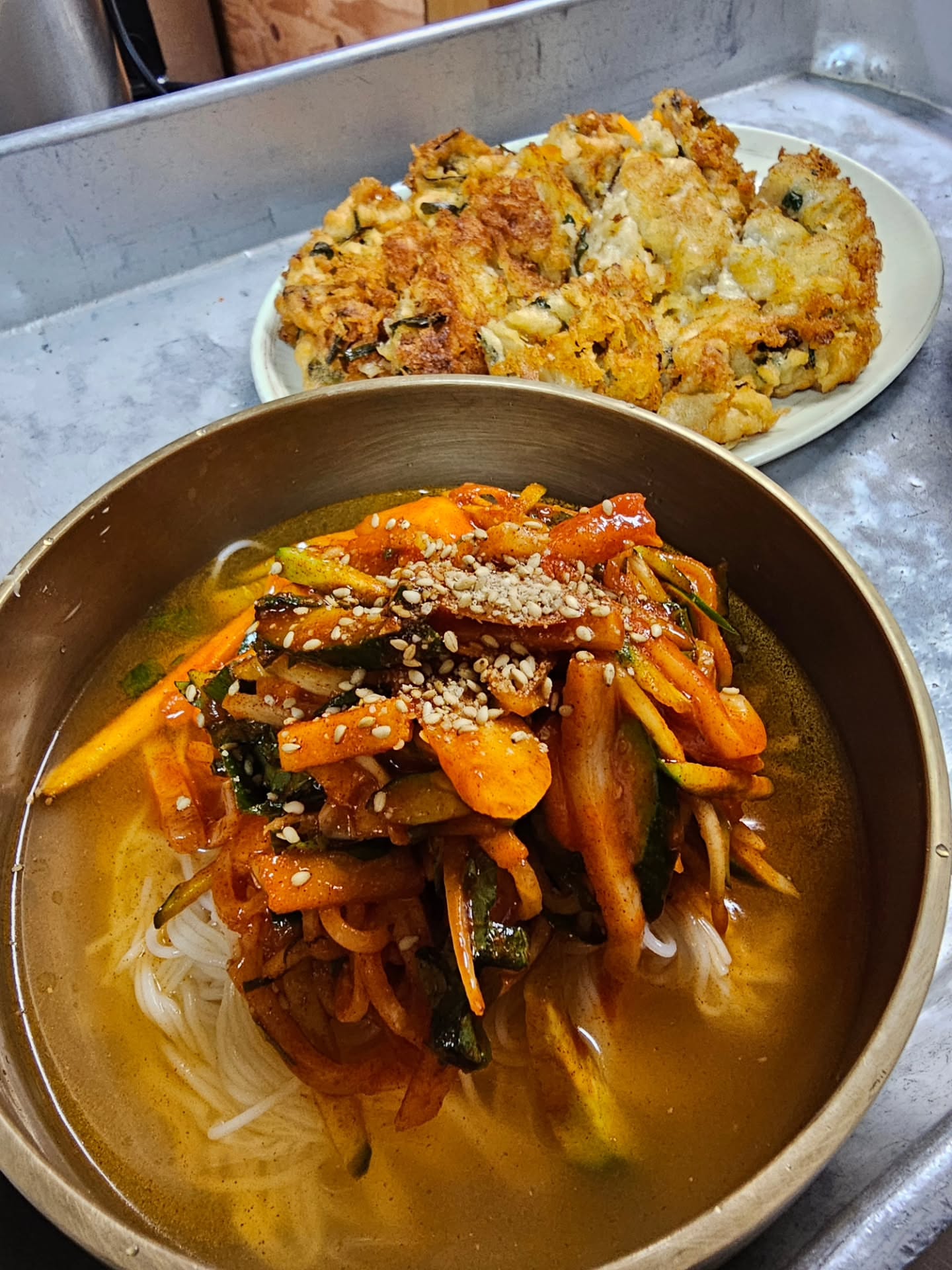 イカの和え物と一緒に冷たくさっぱりとしたスープにご飯かそうめんを入れて食べる済州島の定番料理です!