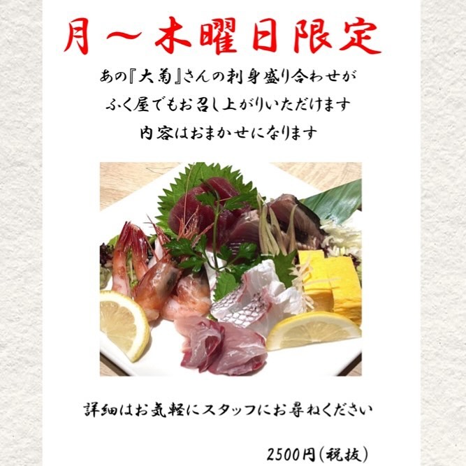 何とふく屋で『大菊』さんのお刺身が❗️来週、24日(月)から大菊さんとのコラボが始まります🙂↕️...