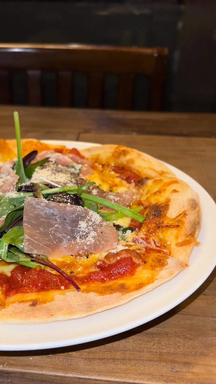 半熟卵と生ハムのピザ🍕...