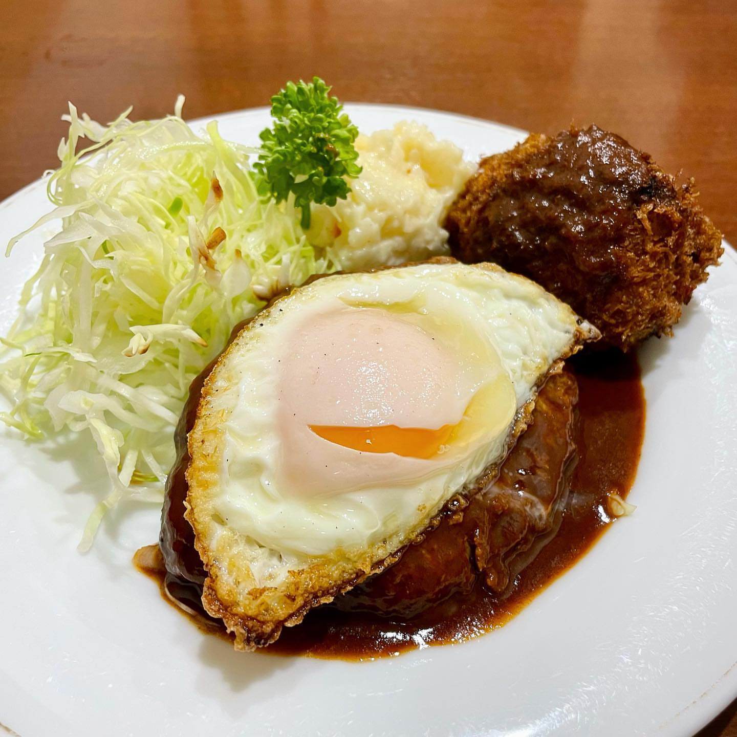 Cream Croquette and Hamburg Steak topped with Fried Egg