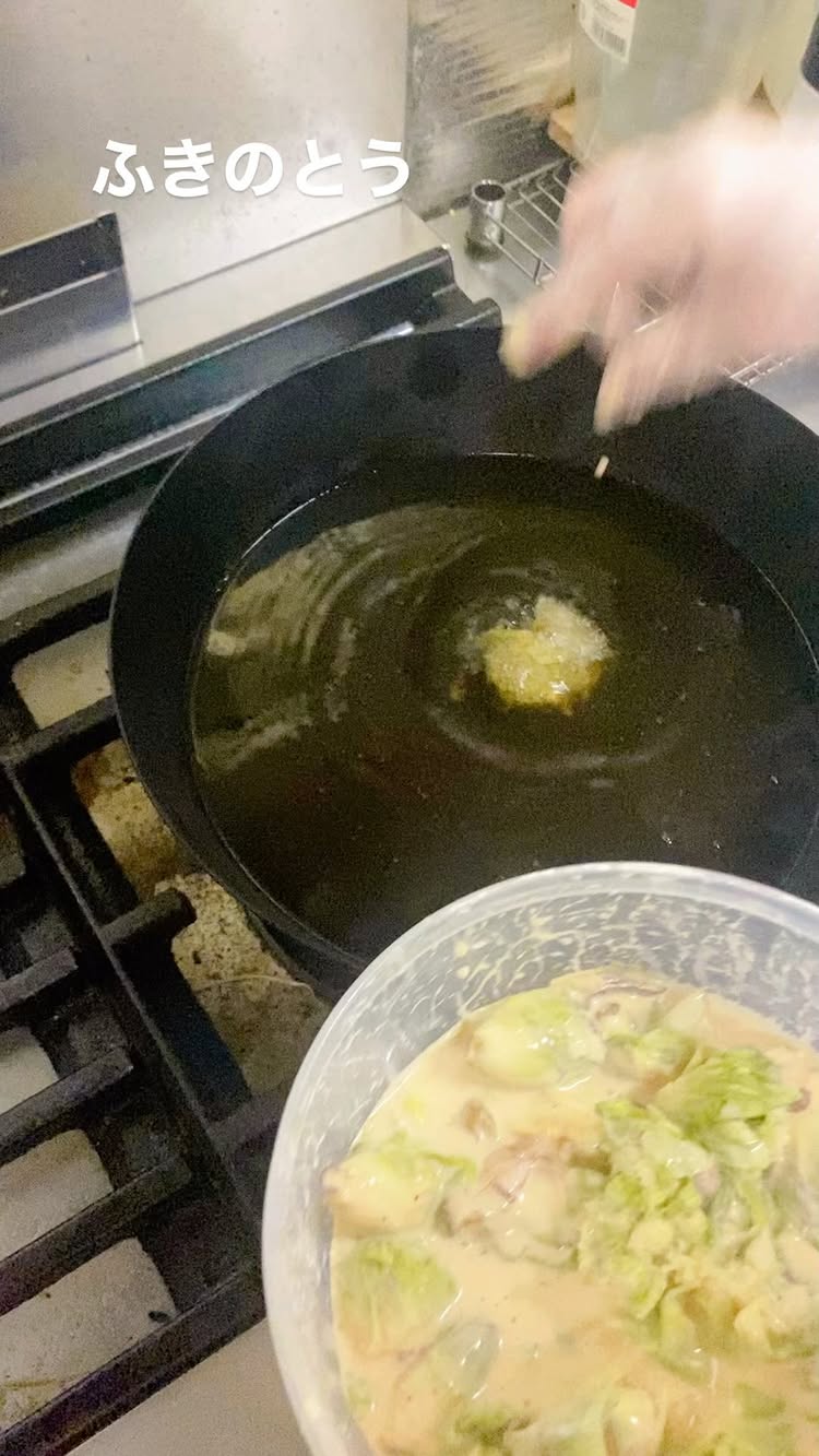 ふきのとうをママ特製の味付けで揚げてます✨