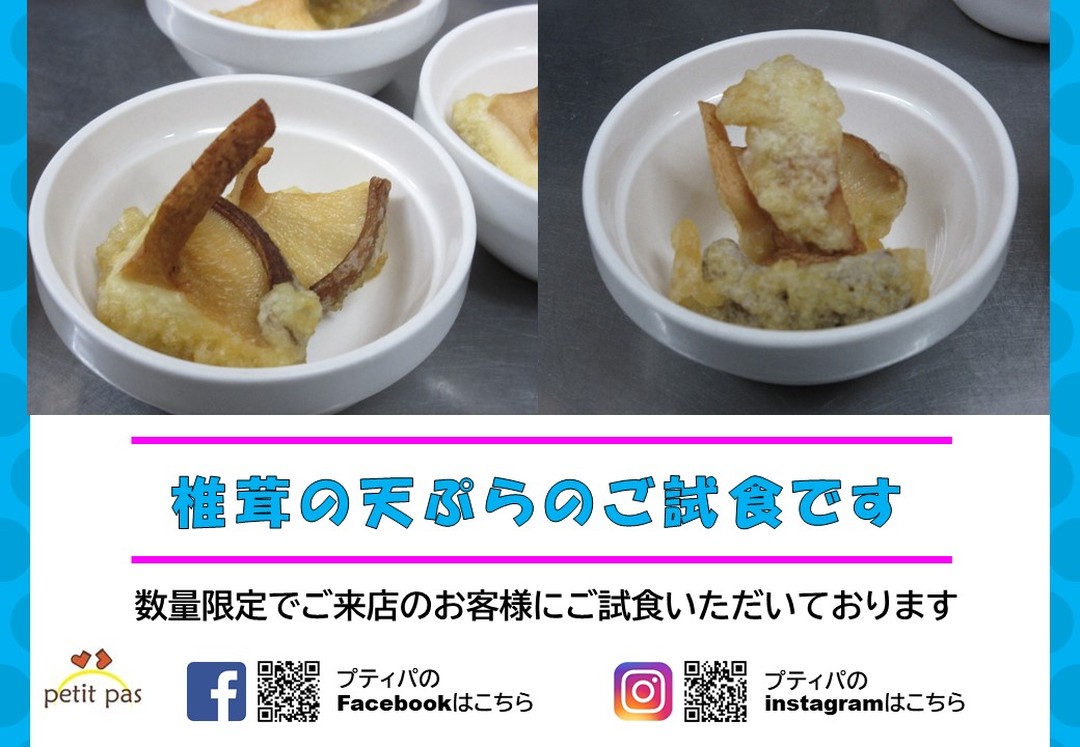 プティパでは、数量限定でご来店のお客様に限り、清田しいたけファームさんの菌床栽培生椎茸「清茸」を天ぷらにしてご試食いただいております。是非ご賞味ください。また、...