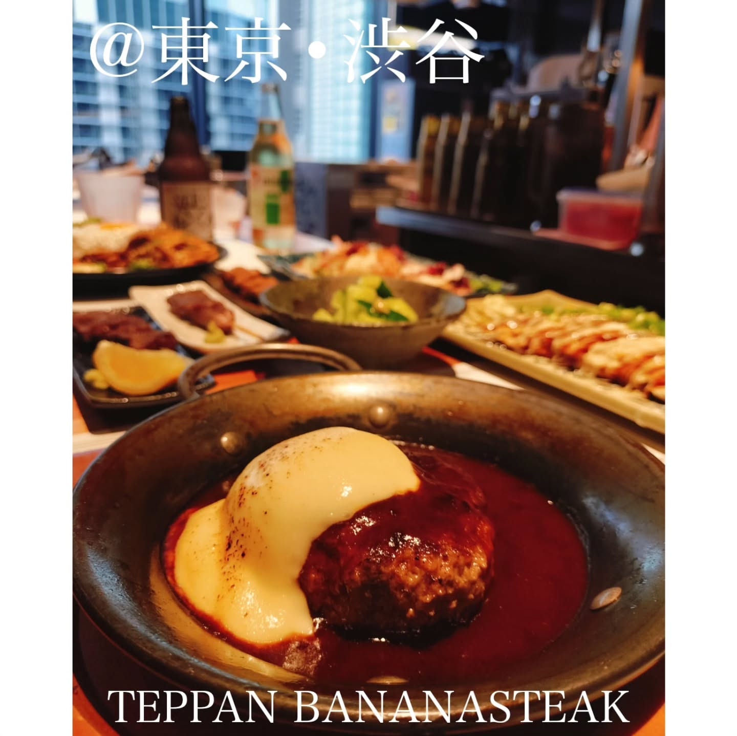 渋谷サクラステージ4Fの鉄板BANANA STEAKは和牛100%ハンバーグを鉄板前で調理。ご飯・味噌汁・サラダ付き・おかわり無料。窓際席からJR眺望を楽しめ、2種のタレとおろしで味わい深い。カウンター中心・1〜3名利用。プレオープン中、正式オープンは7/25予定。