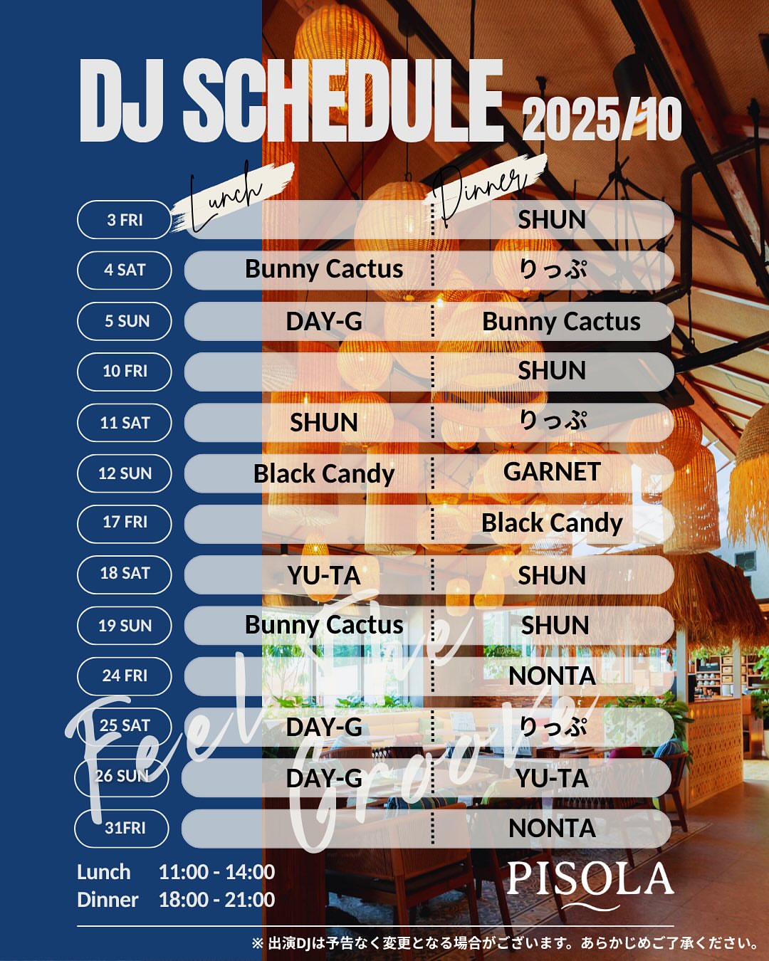 昨日に引き続き今夜も18:00-21:00でPISOLA大磯店にてDJしております。嬉しい事にブース前で踊ってくれちゃう方がいたり、ブース裏の席の子供達が盛り上...