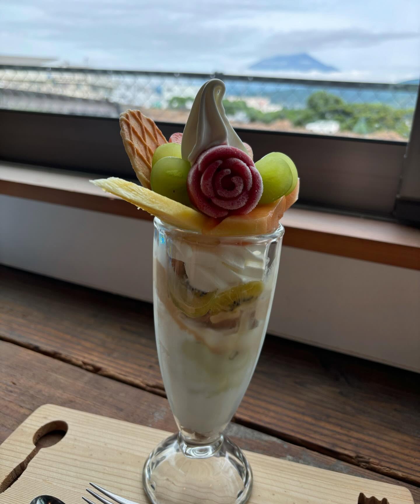 静岡県富士市のエコフィールド内にあるカフェです。日替わりのフルーツを使うフルーツパフェが看板で、杉山フルーツの果実と朝霧高原のミルクソフトが味の特徴です。晴れた日には窓際から富士山が望めます。