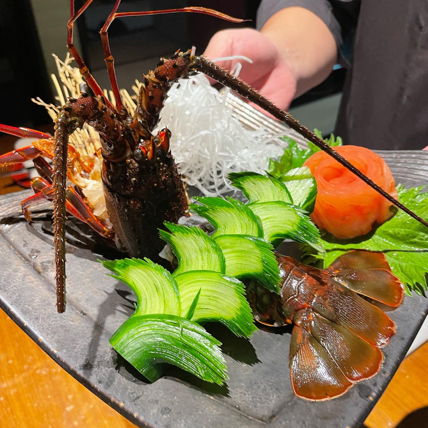 伊勢海老活き造りと味噌汁、炊き込みご飯に大満足♡