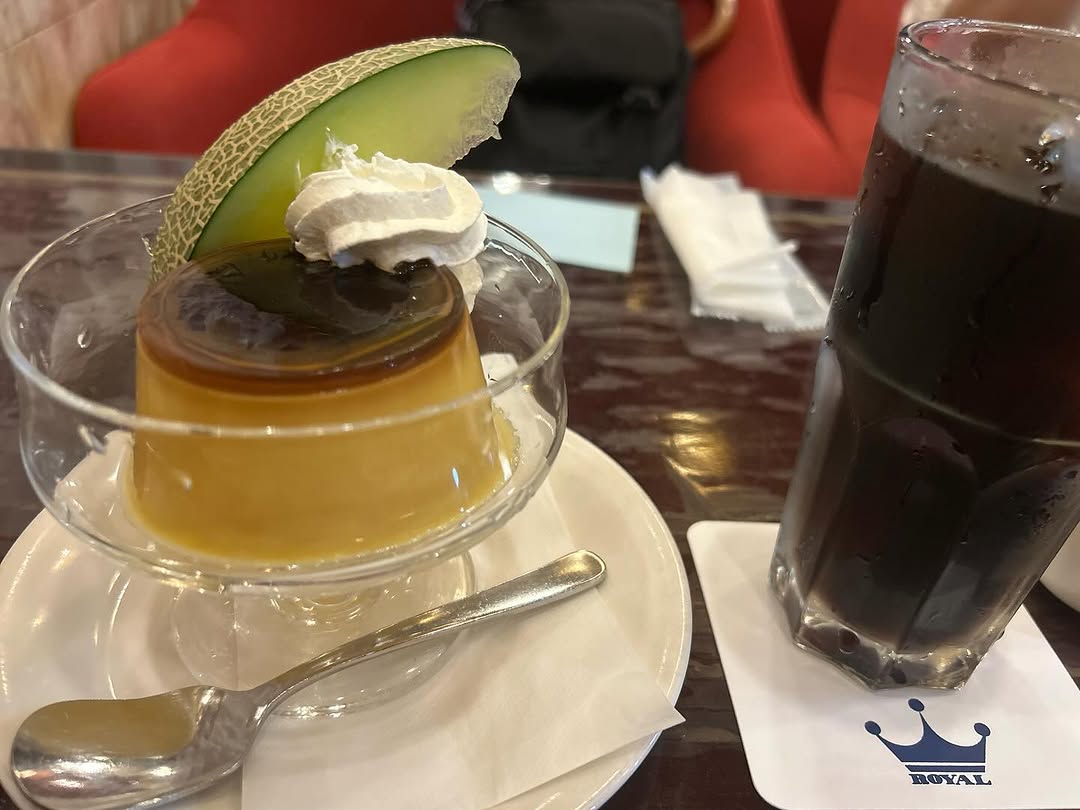 有楽町のローヤルは東京交通会館の地下1階にある喫茶店です。赤いレトロソファと落ち着いた雰囲気が特徴で、プリン(850円)は硬めで食べ応え十分。喫煙ブース完備で店内は禁煙対応、ウェイターの方々の雰囲気もぴったりです。