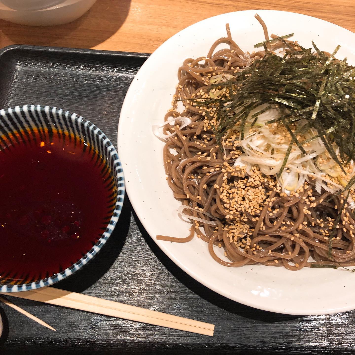 海苔胡麻もりそば(卵1個、天かす自由)500円。