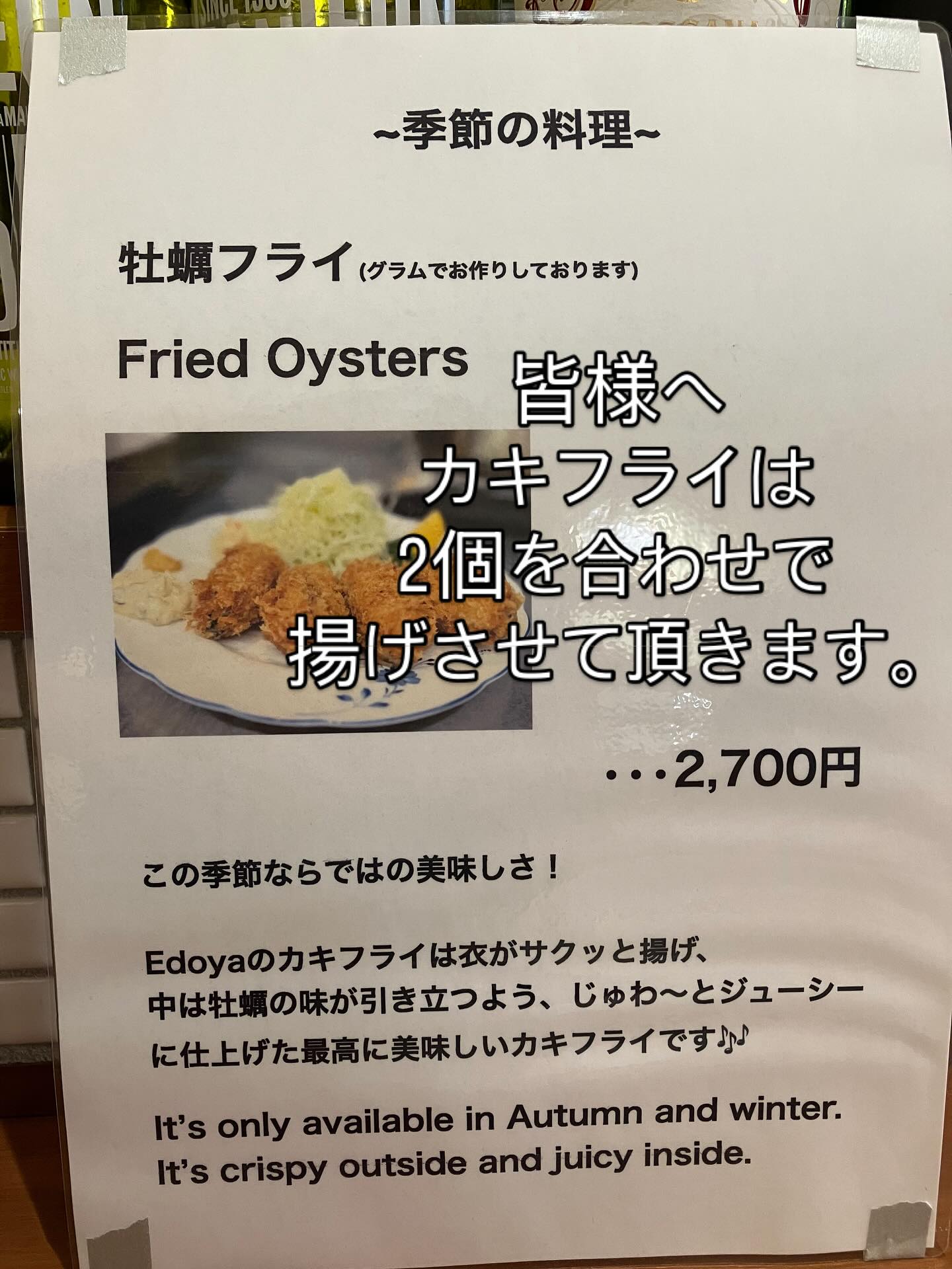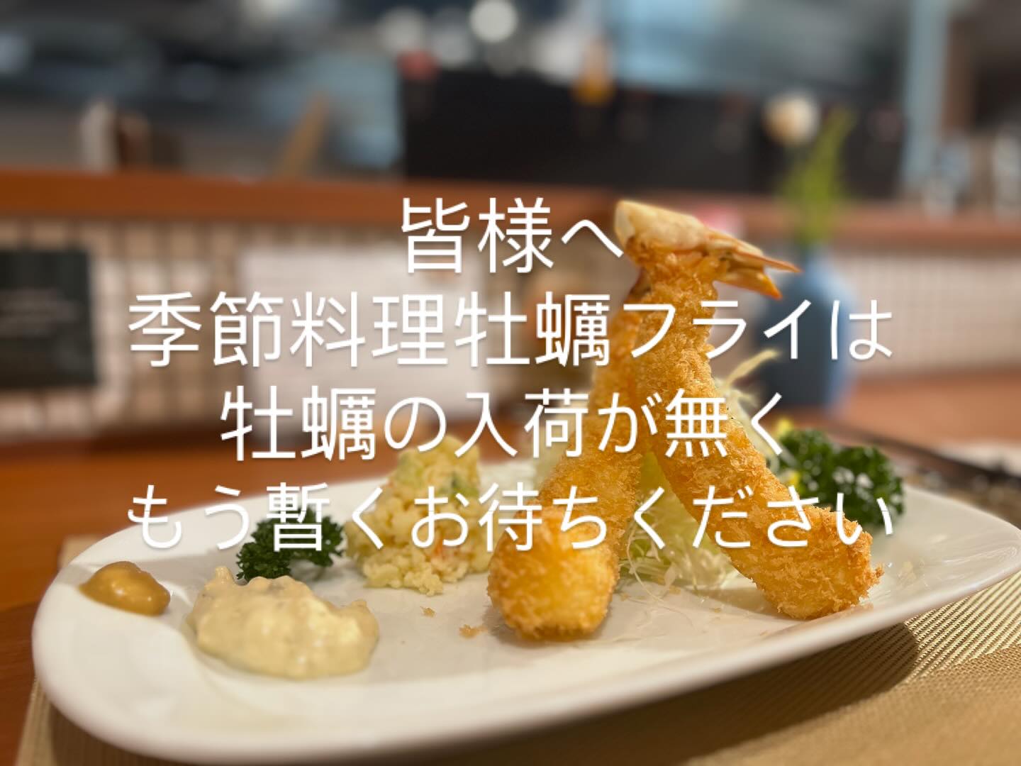 先日のご案内でカキフライを一つ揚げで提供とお伝えしましたが、やはり、美味しさを考えまして2個合わせでお作りさせて頂くことになりましたので宜しくお願い致し...