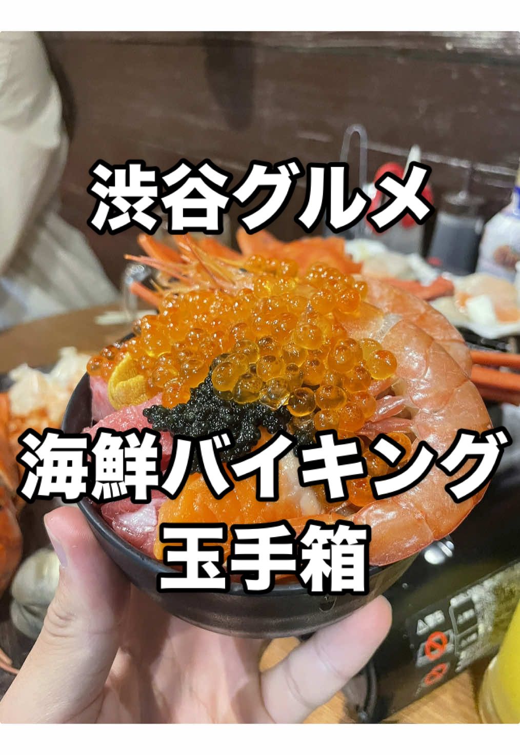 渋谷駅から徒歩3分の「玉手箱」は、60品以上の海鮮食べ放題と目の前で焼ける浜焼きが魅力です。国産本マグロ・イクラ・ウニ・キャビアなど豪華素材が揃い、自分だけのオリジナル丼も楽しめます。90分制の贅沢空間です。