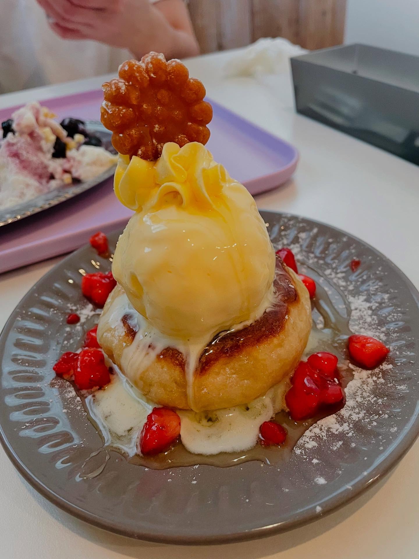 いちごの色してる方は蜂蜜チーズのホットグ、ブルーベリーチーズのがかき氷です✨