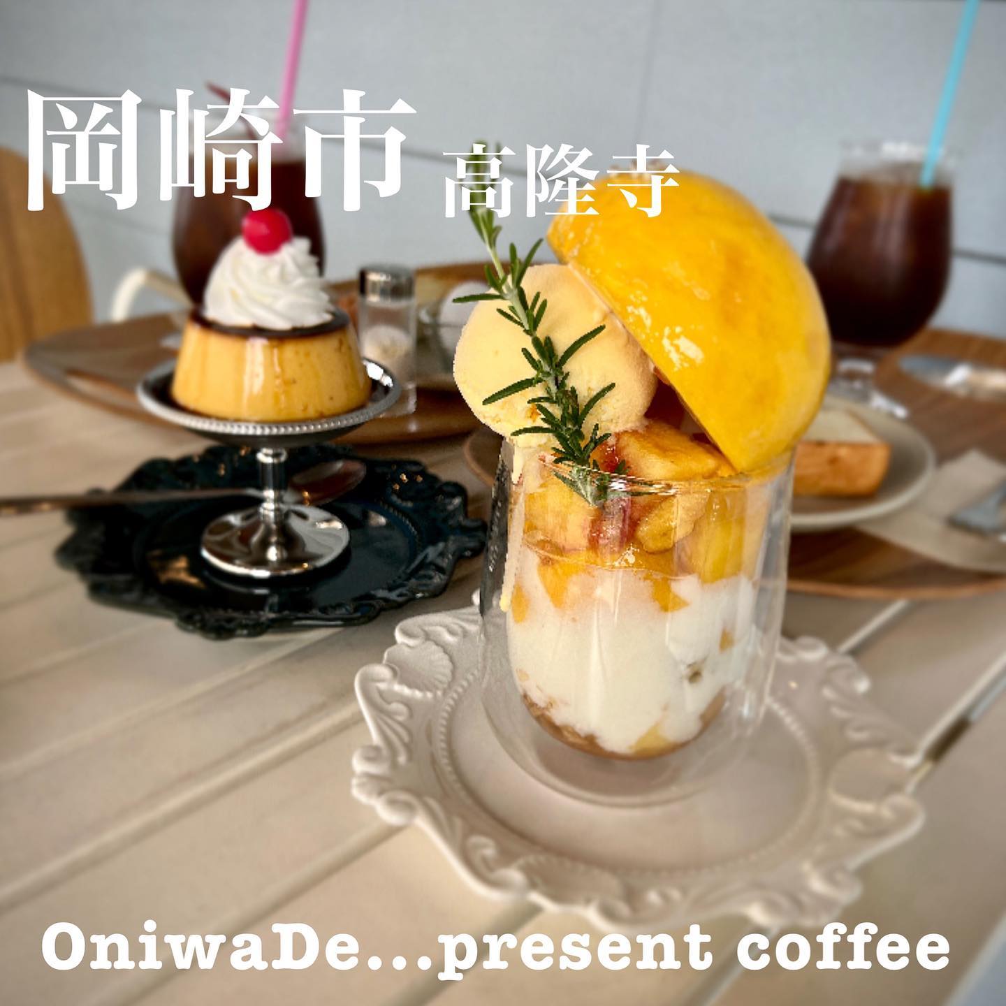 岡崎市の OniwaDe... present coffee は、公園のような癒しの空間で、TREE TERRACEのブランコ席やテラス、キッズスペース、写真映えスポットが魅力です。看板メニューは丸ごと生黄桃の艶パフェと昔ながらのプリン、深煎りブレンドです。