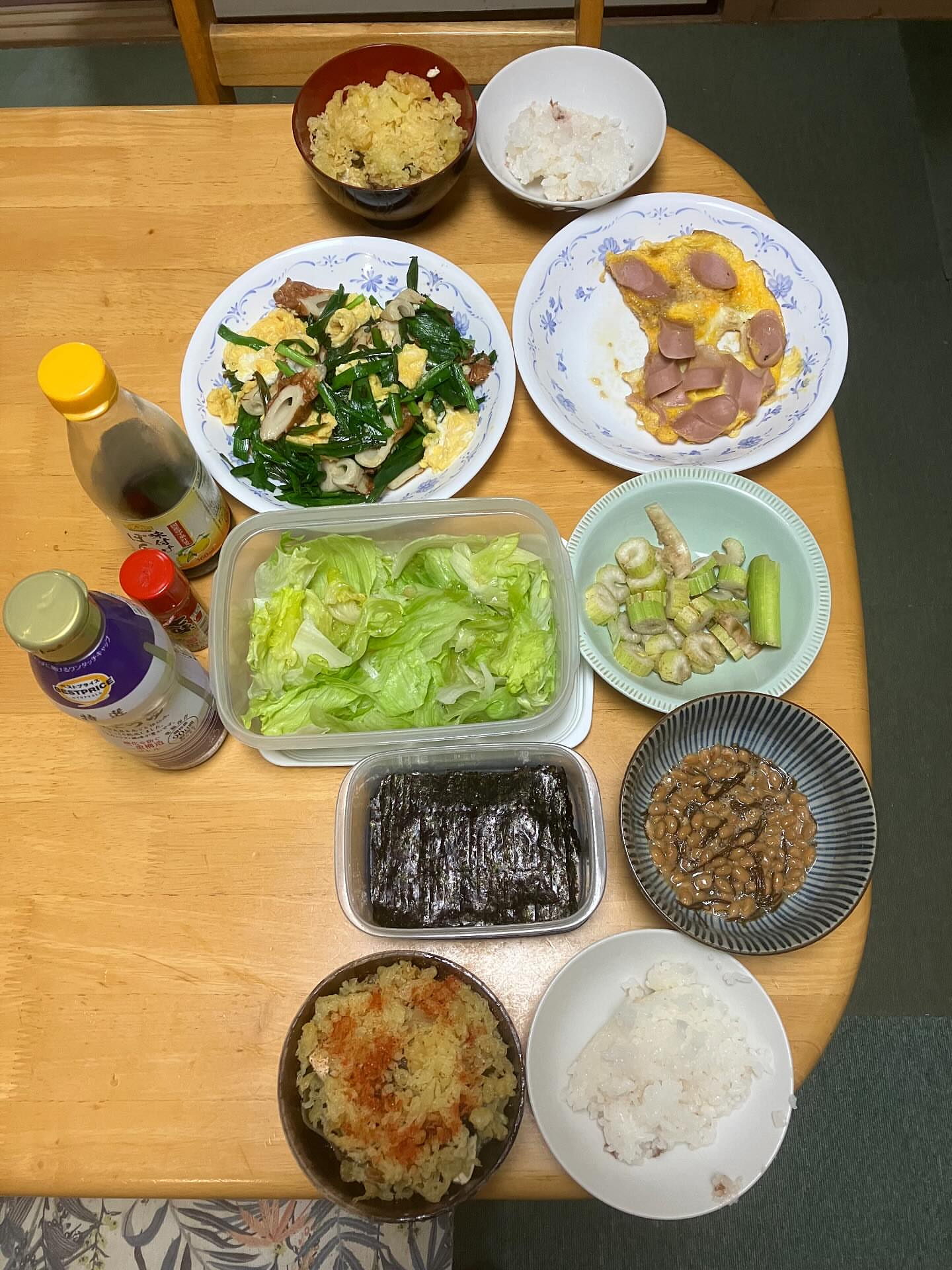 夕飯に奥薗流ニラ玉🥚を作りました😃ご飯は保温🍚味噌汁魚肉ソーセージ卵つけ焼きはレンチン🙂味噌汁には天かすを入れました🙃もずく酢入り納豆と焼き海苔🙂レ...