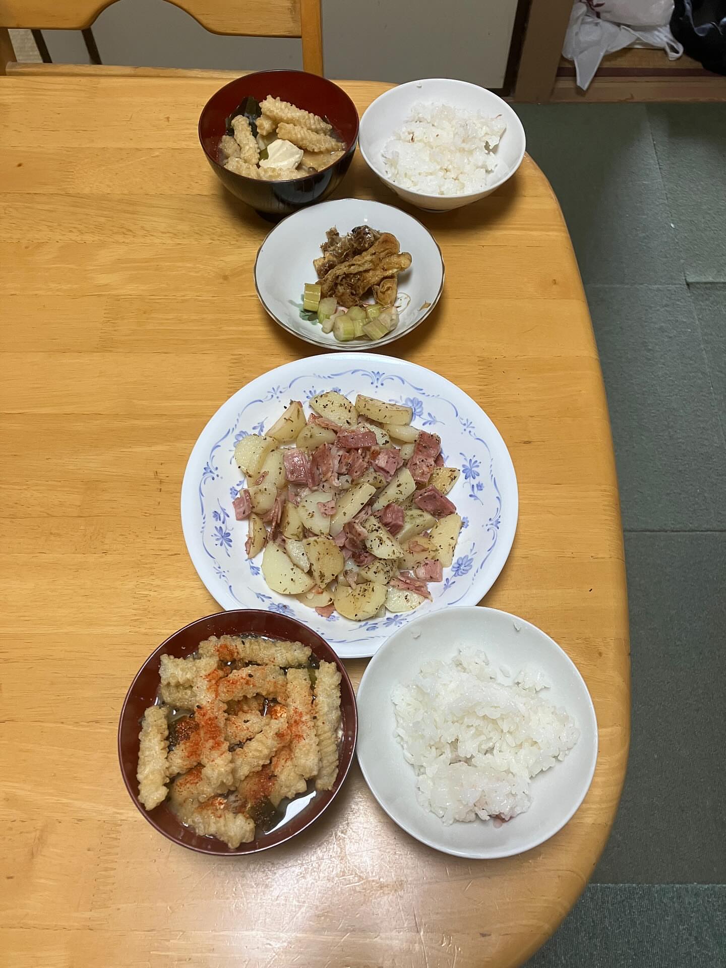 昼飯にジャガベーコンを作りました🥔🥓ご飯は保温🍚味噌汁はレンチン🙂味噌汁にはひねり揚げを入れました🙃土佐甘とうと油揚げのおかか醤油炒め🌶️🦊母のセ...