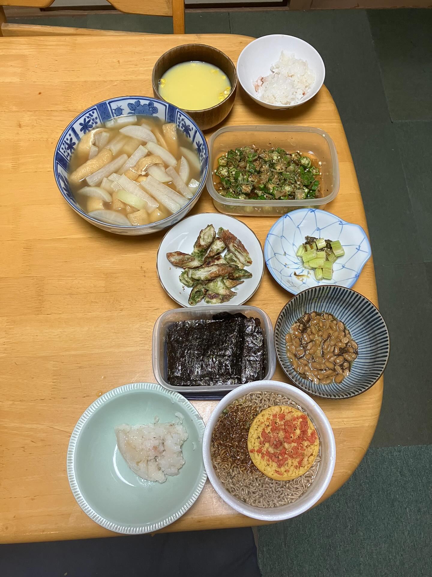 夕飯に大根と油揚げのめんつゆ煮🦊オクラおかか漬け🙂を作りました😃ご飯ちくわの磯辺焼きはレンチン🍚母既製品コーンスープ🌽ボクカップ天そば🙂もずく酢入り...
