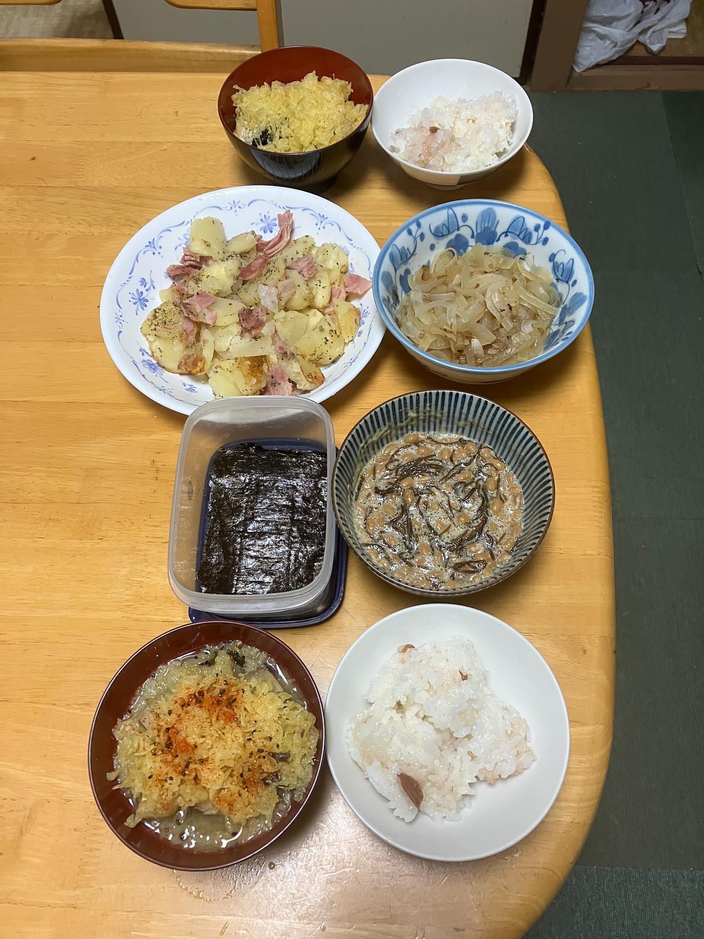 夕飯にジャガベーコン作る🥔🥓ご飯味噌汁万能蒸し玉ねぎはれんちん🍚味噌汁には天かすを入れました🙃もずく酢入り納豆と焼き海苔🙂今日も美味しい夕飯🍽️ご馳...