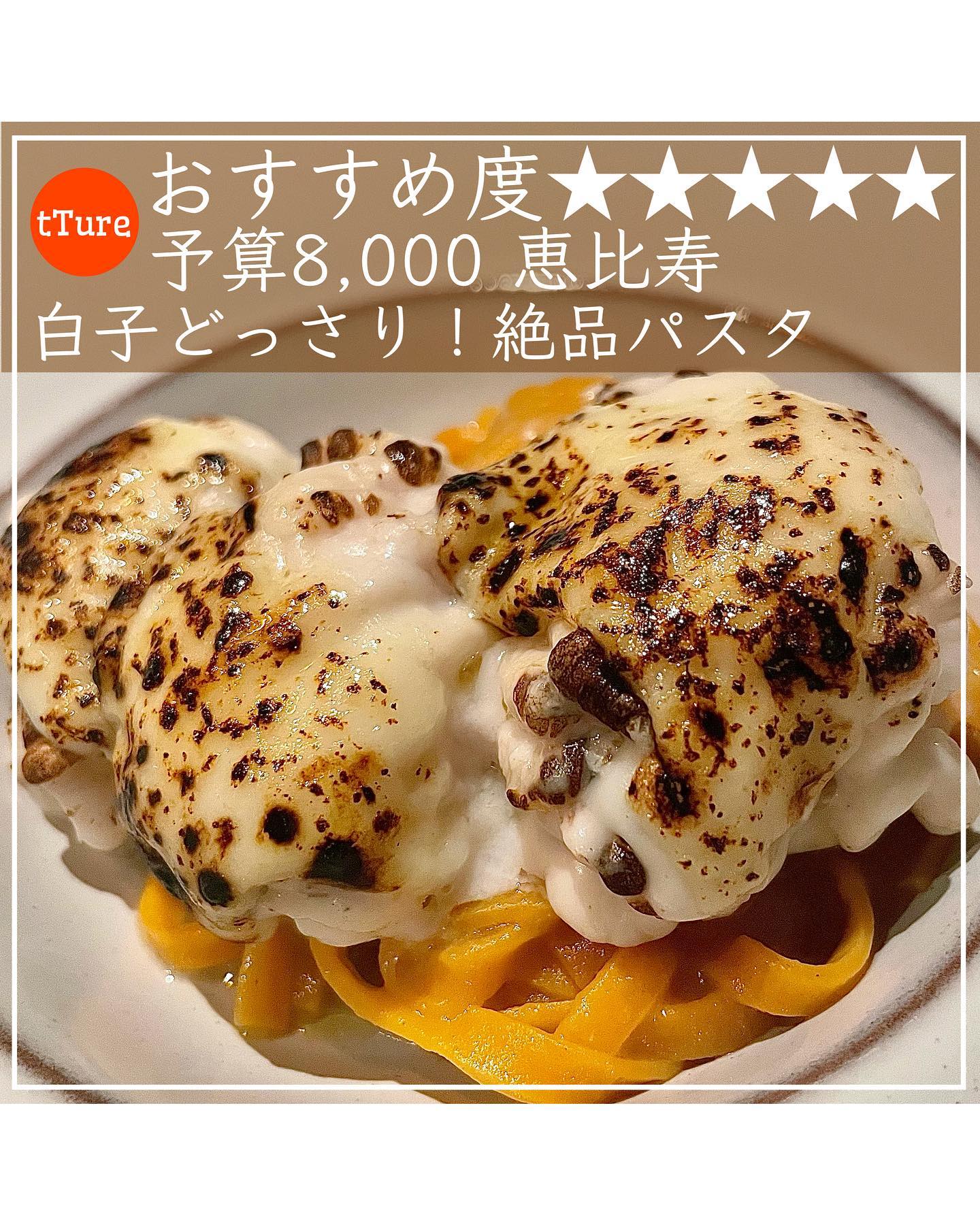 恵比寿の自然派イタリアンtTureです。白子のパスタと大ぶり白子、トマト練り込みのタリアテッレが絶品です。仔羊のローストも柔らかく、季節でメニューが変動します。白子パスタは事前問い合わせ推奨です。ディナー後は自然派ワインのバータイムもお楽しみいただけます。