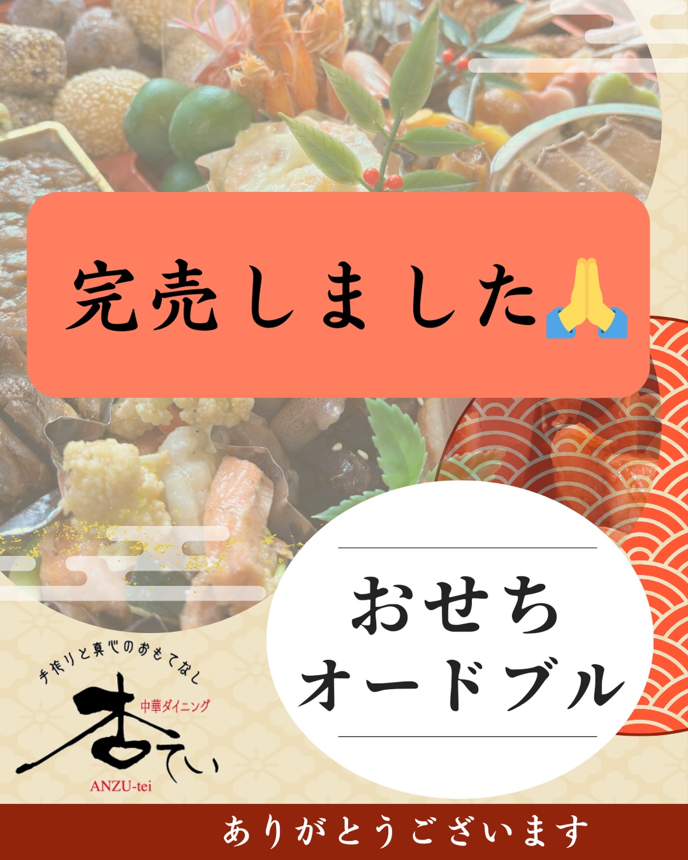 杏ていお節オードブル12/31〜1/2お渡し分が完売しました。