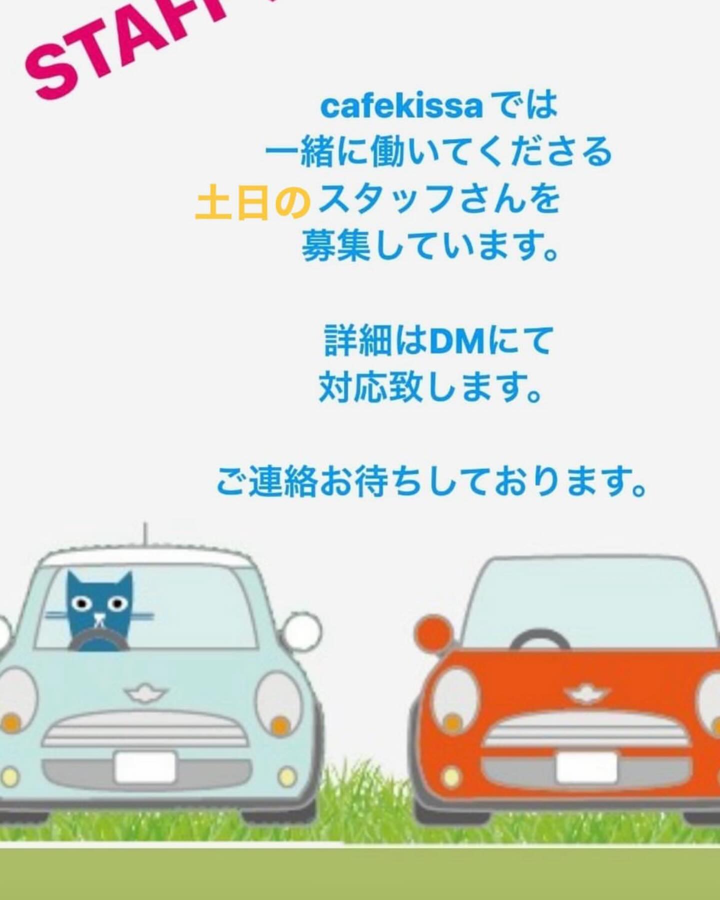 やしお駅前公園の近くにある、お馴染みのカフェキッサさん(@cafe_kissa )で土日のスタッフを募集しています。