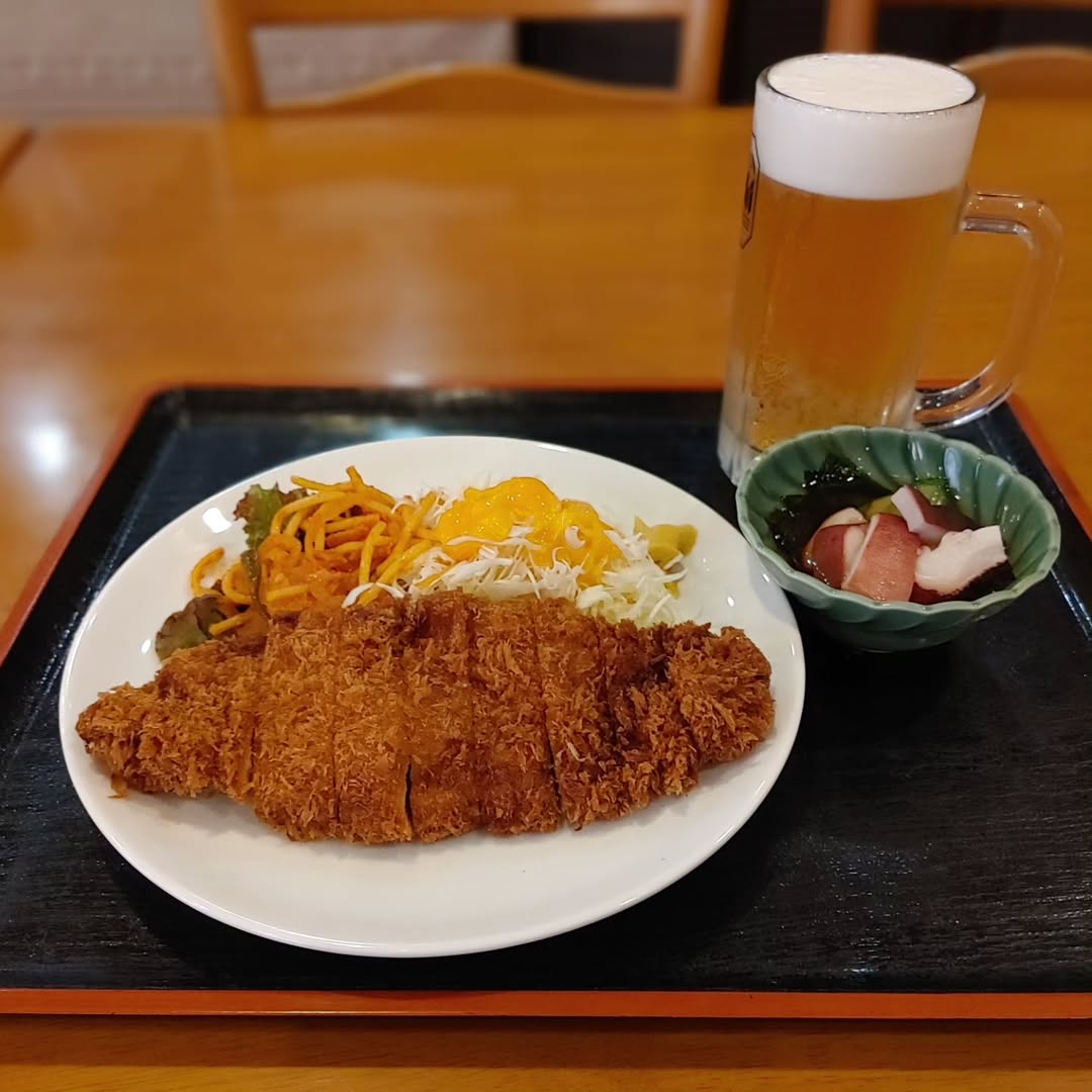 #海楽#晩ごはんシリーズ#beefカツ#タコの酢の物#生ビール #残り僅か#出張#船ではキハダマグロ...