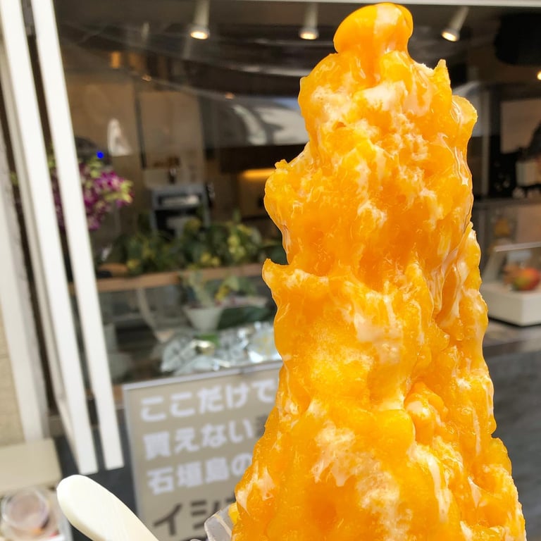 石垣島のカキ氷店「石垣果汁屋」では、マンゴーカキ氷が看板メニューです。高さ30cm以上のボリュームで、二人分ほどの量。お値段も手頃で、暑い日にはぴったりの甘くボリューミーなひとときです。
