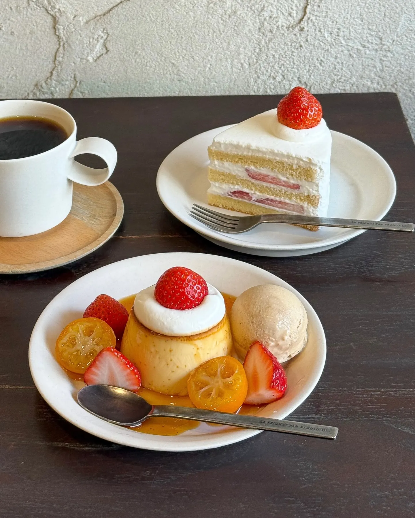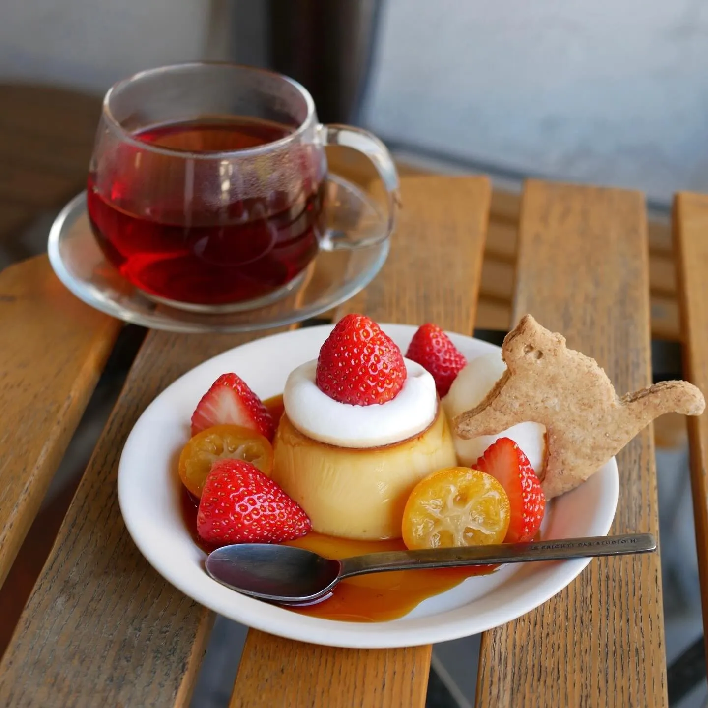 きび砂糖のやわらかいぷるぷるプリンに、いちごと金柑の白ワインコンポート。
