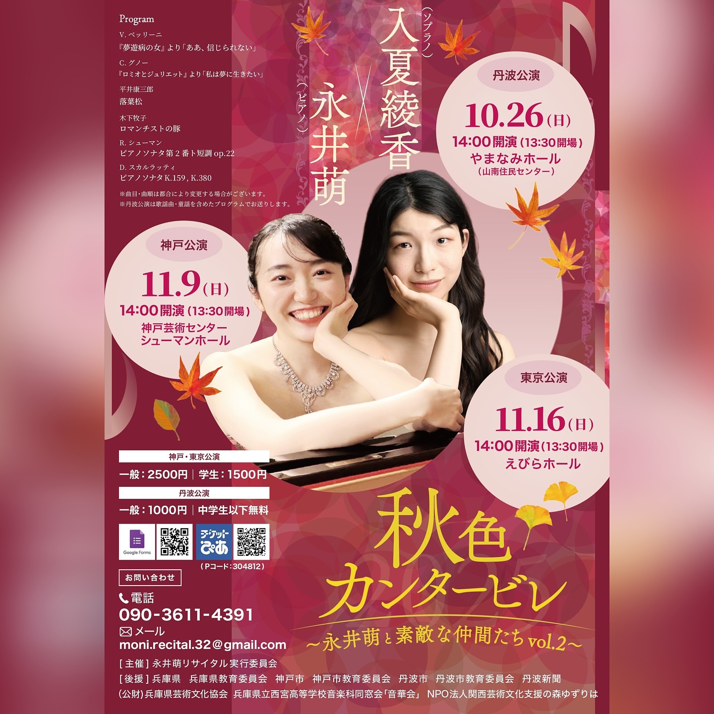今年の秋、大学で同級生だった入夏綾香さん (ソプラノ)と一緒に、丹波・神戸・東京でコンサートをさせていただくことになりました🍁...