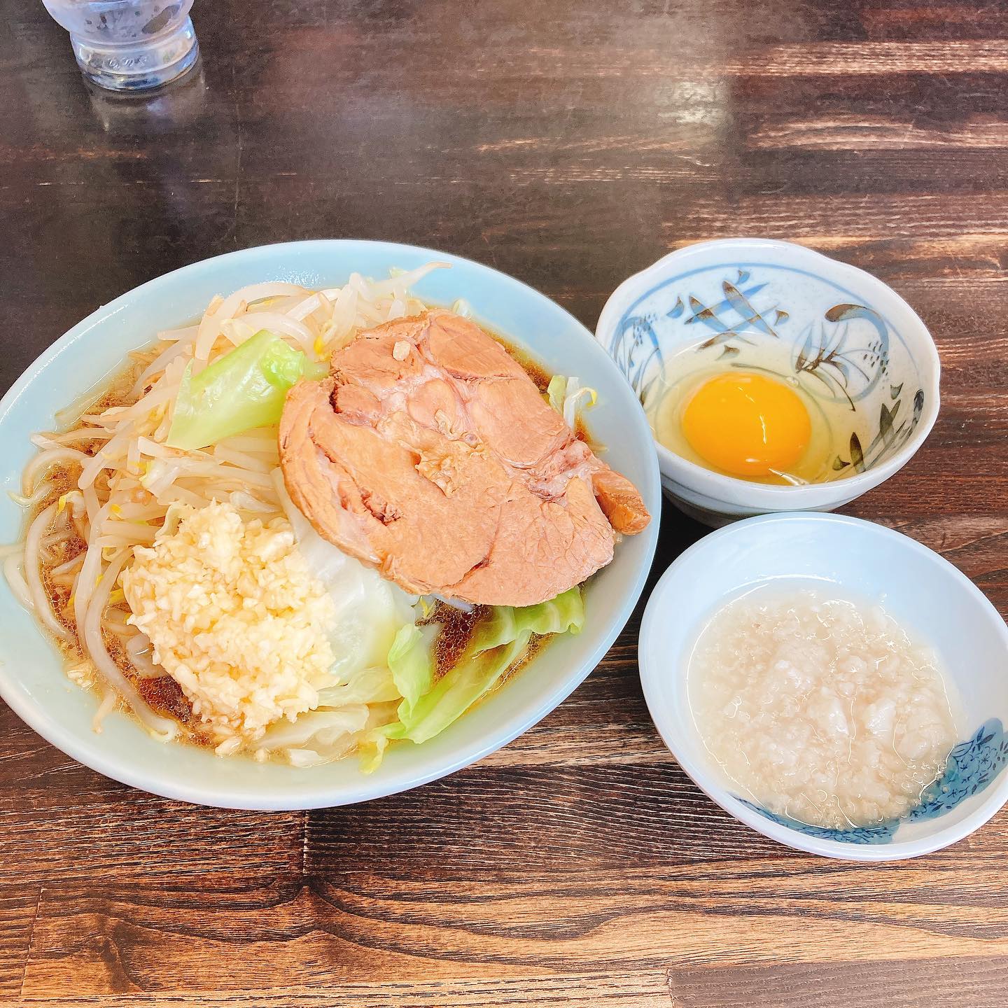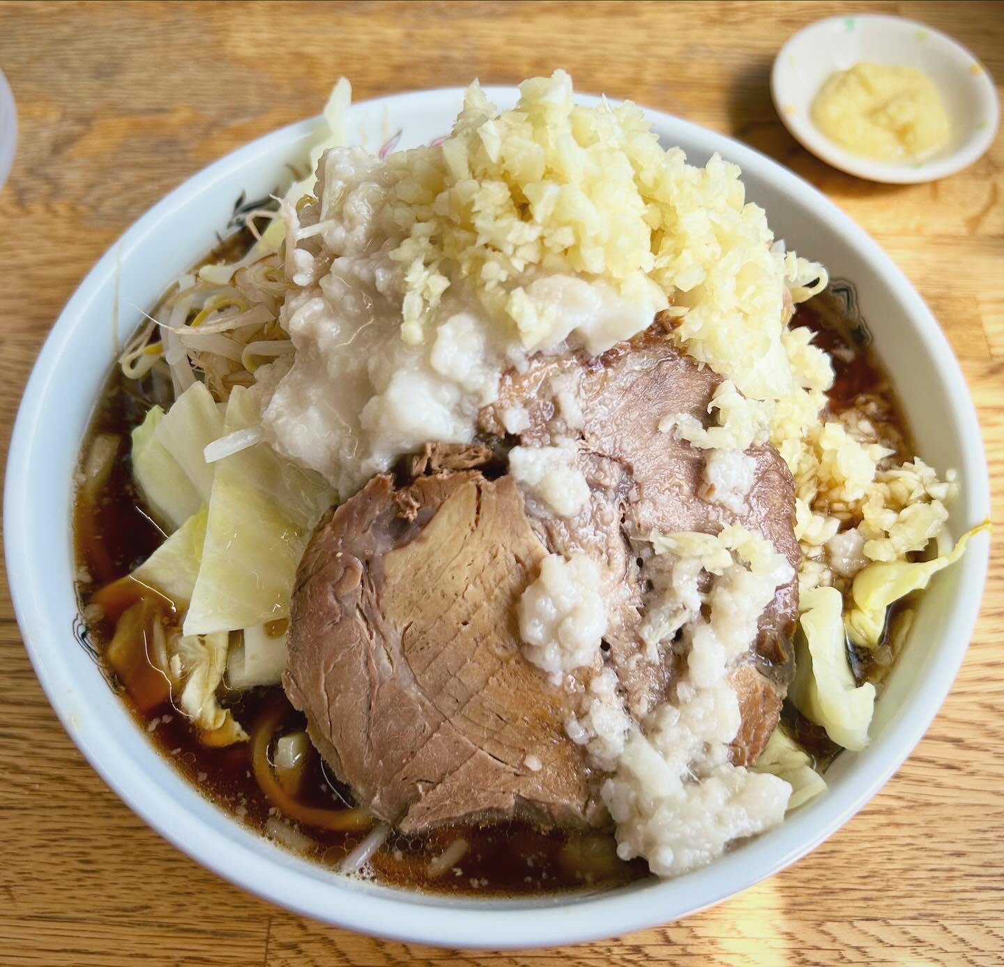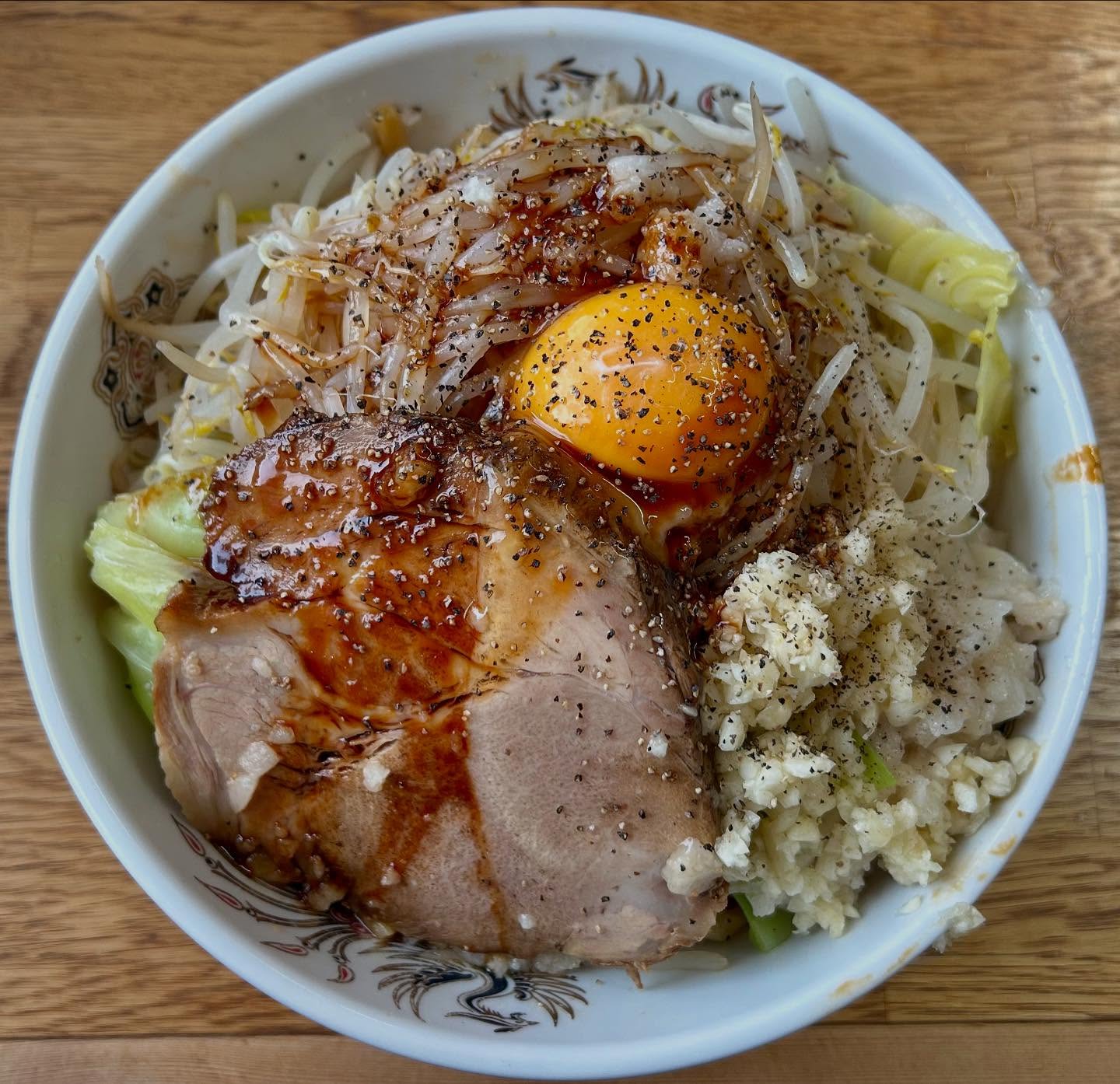 麺半分、ニンニク野菜アブラマシ、生卵追加でアブラ別盛りでお願いした😆