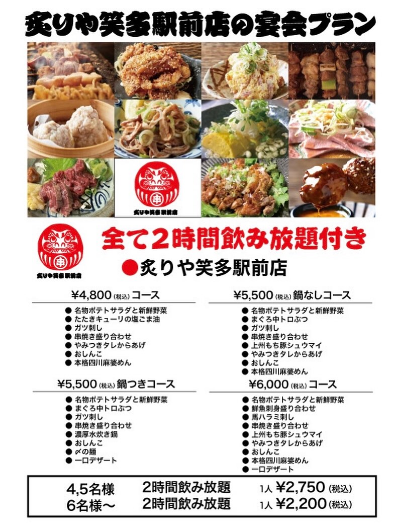 駅前店は4つの宴会コース、ご用意しています。