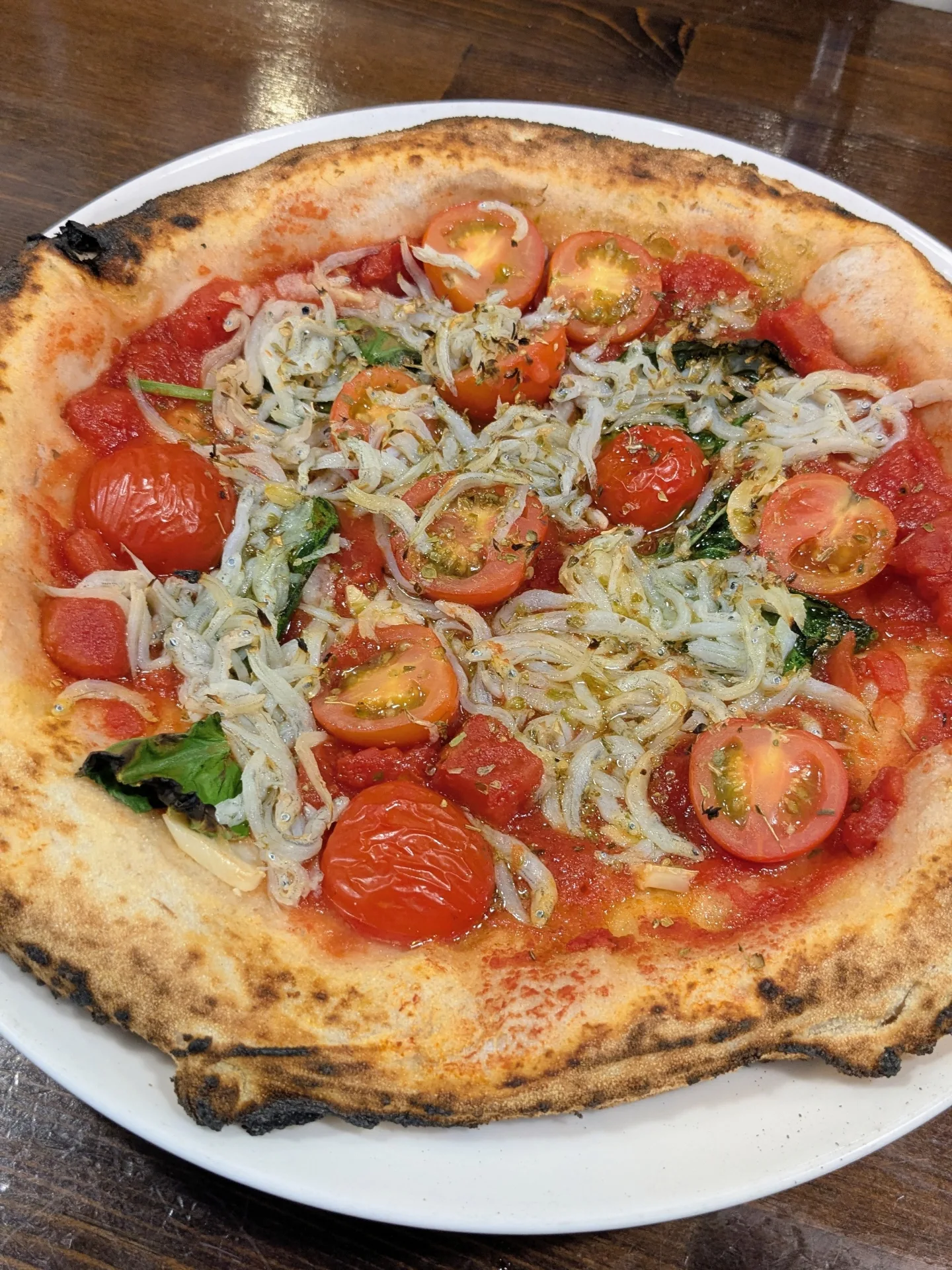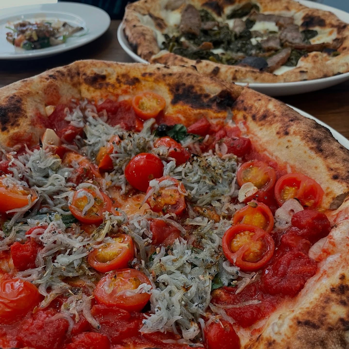 マリナーラベースのシラスピザと菜の花のオイル漬けとサルシッチャの...