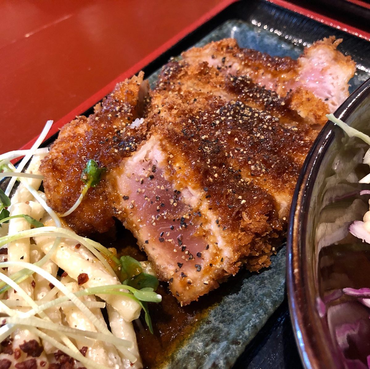 本日の日替わりは、大人気のマグロのレアカツと、あったか水餃子🥟です🤗